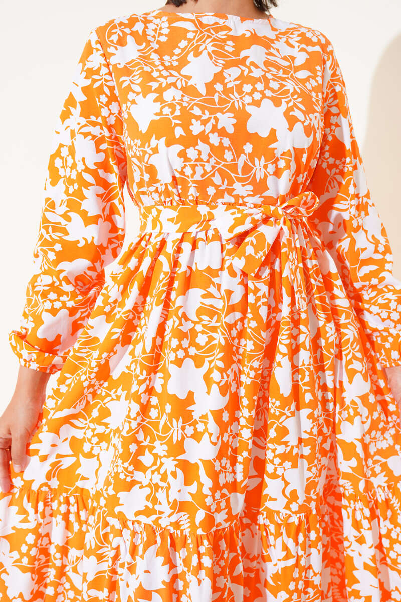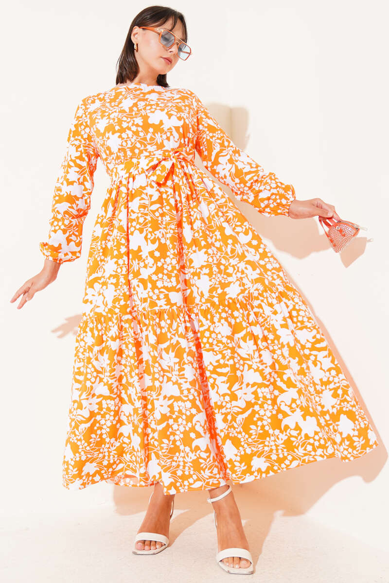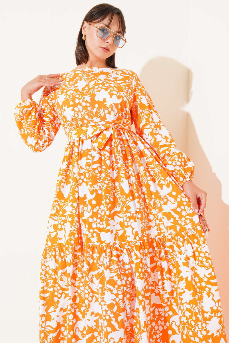 Çiçek Desenli Kemerli İndigo Şifon Elbise