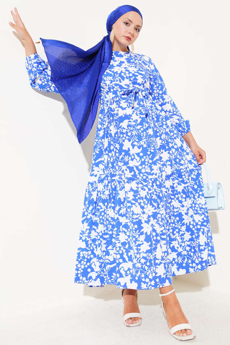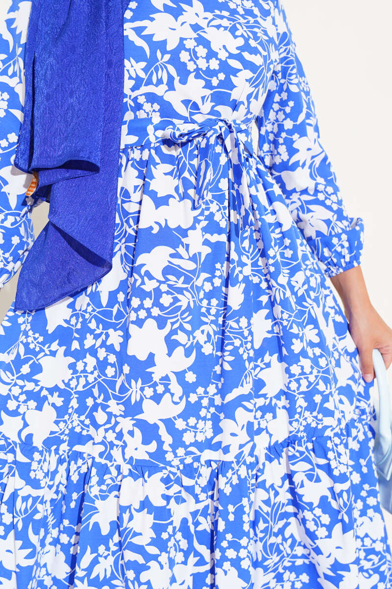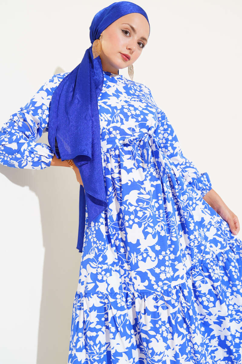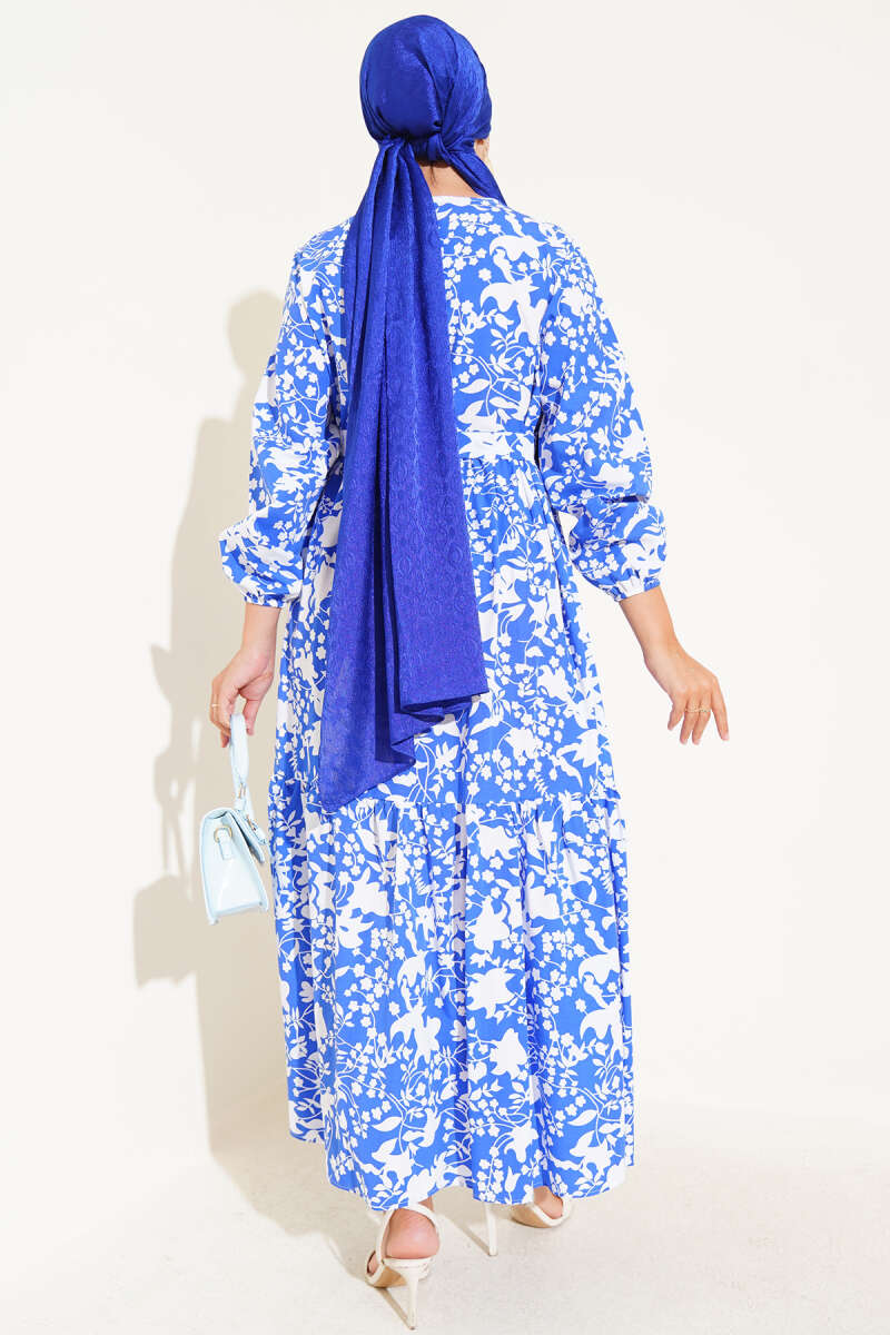 Kruvaze Yaka Desenli Saten Elbise Turkuaz