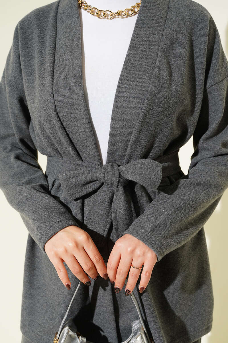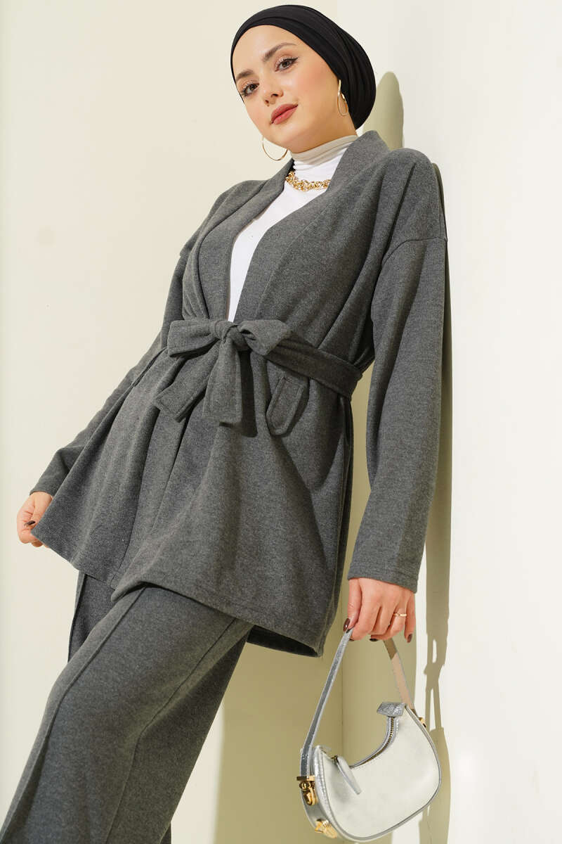 Kuşaklı Fitilli Kaşe Kimono İkili Takım Siyah