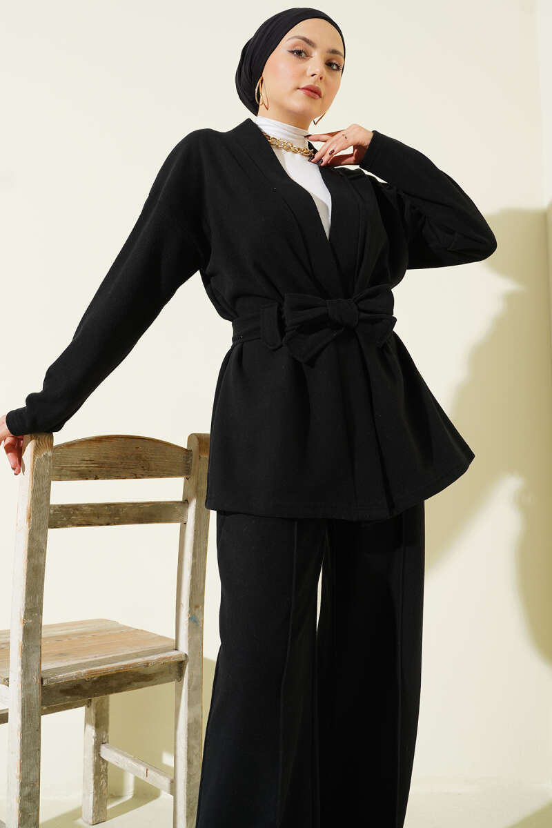 Kuşaklı Fitilli Kaşe Kimono İkili Takım Füme