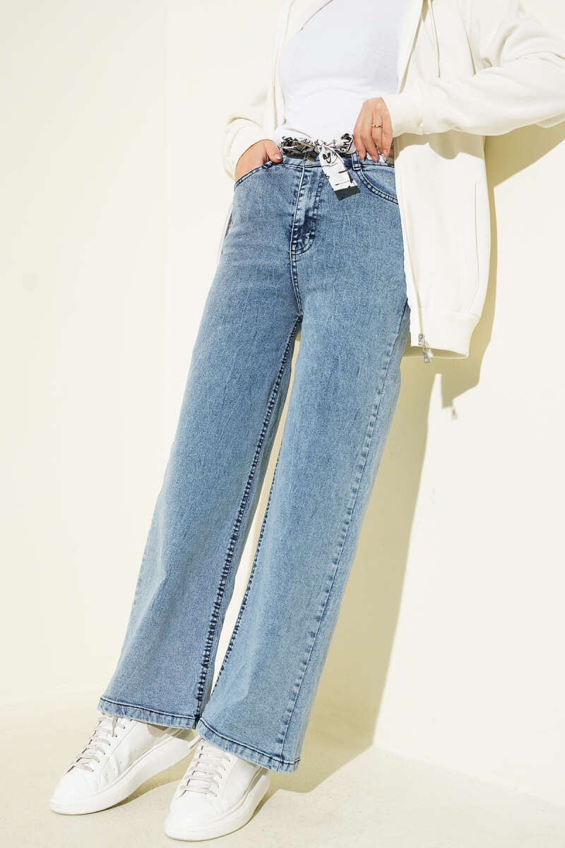 Kuşaklı Geniş Paça Kot Pantolon Açık Kar