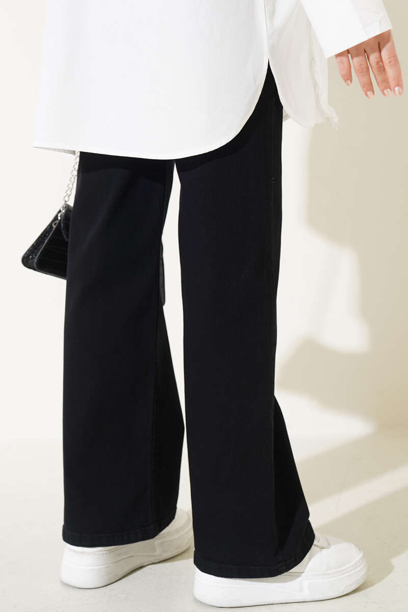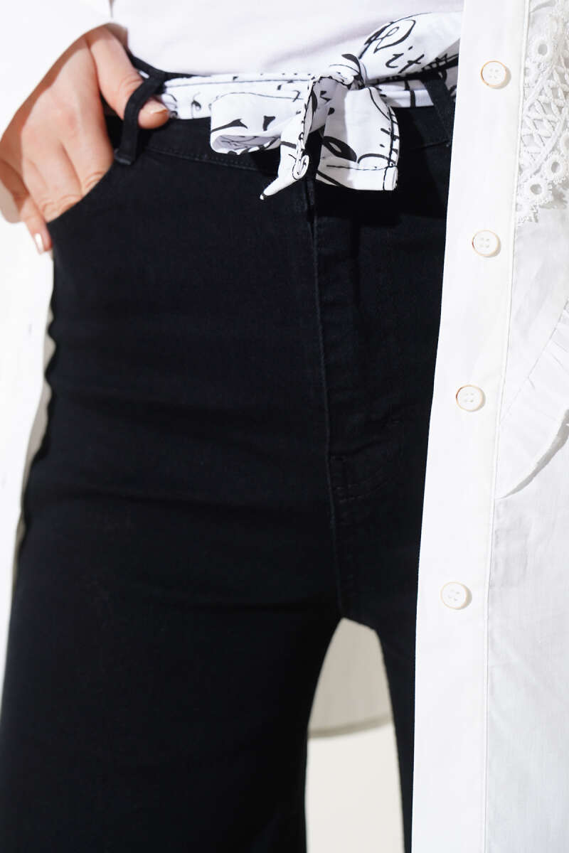 Kuşaklı Geniş Paça Kot Pantolon Siyah