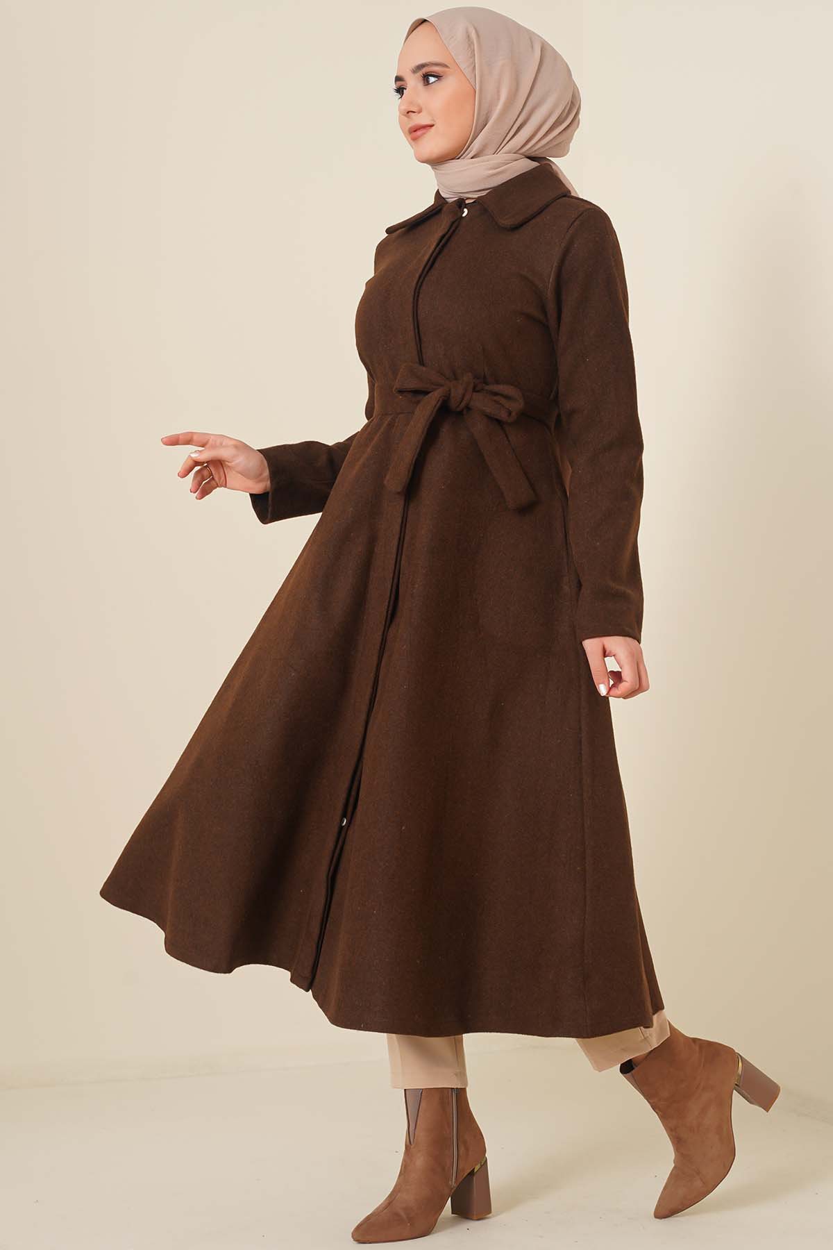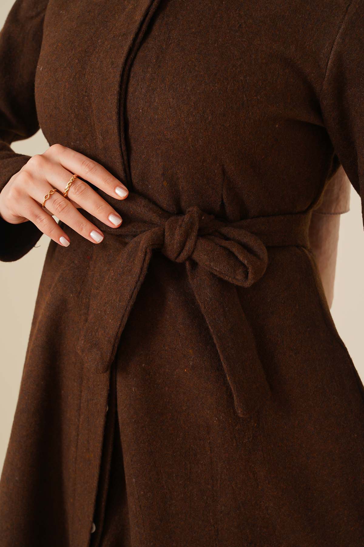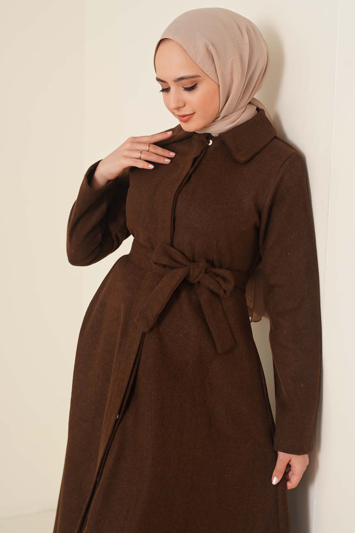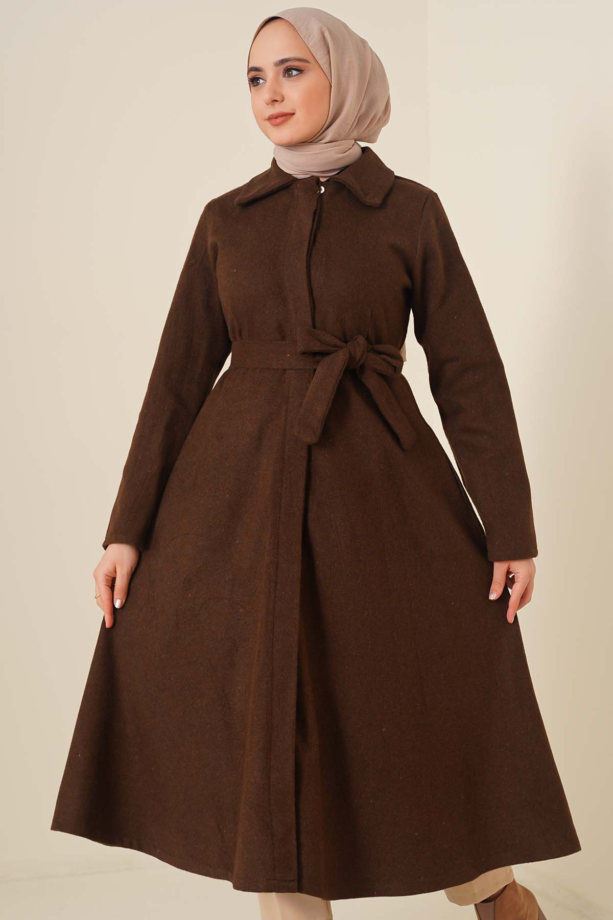 Kuşaklı Gizli Düğmeli Kaban Kahve