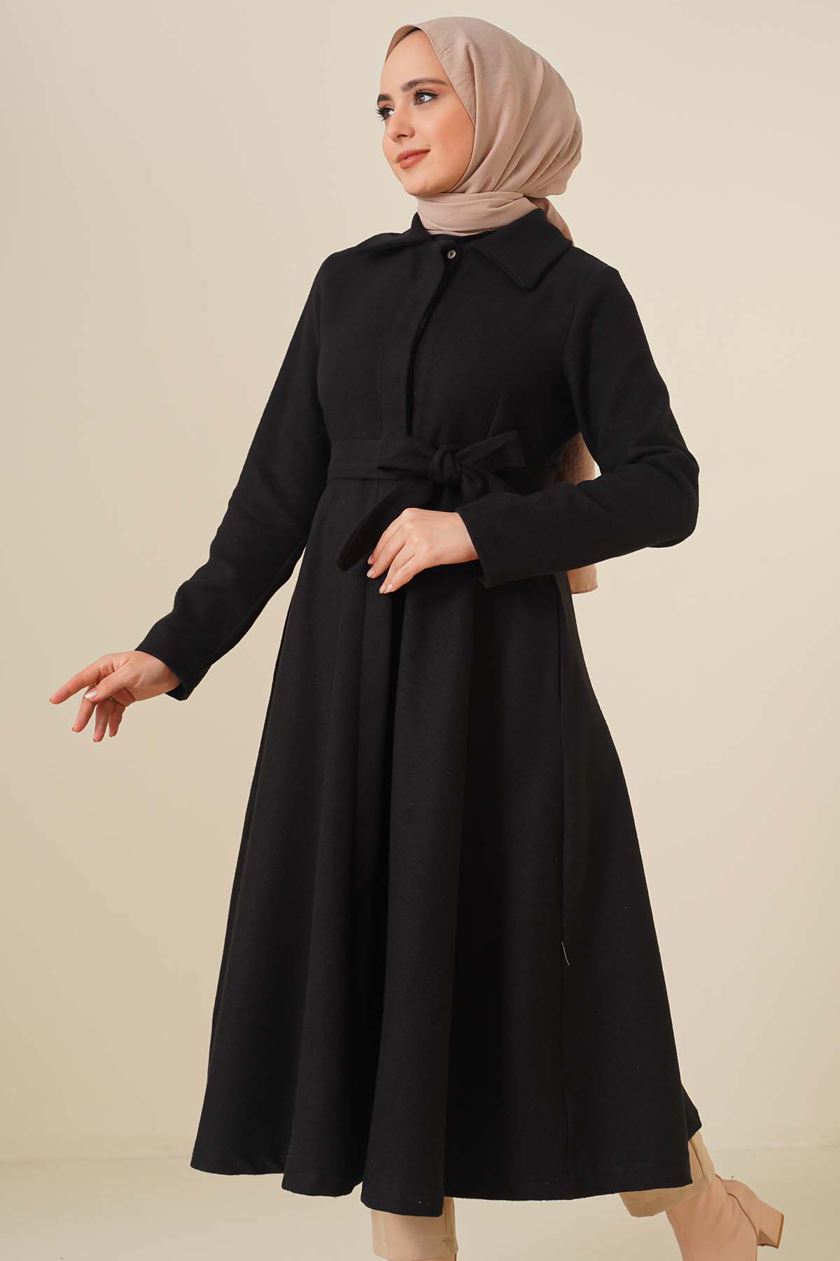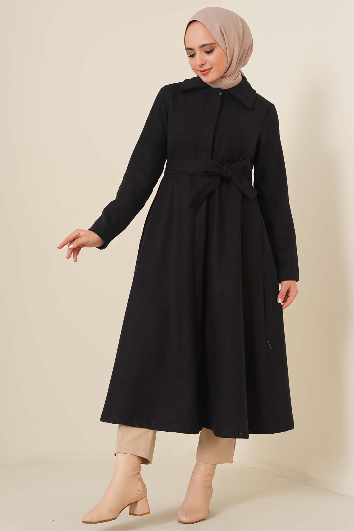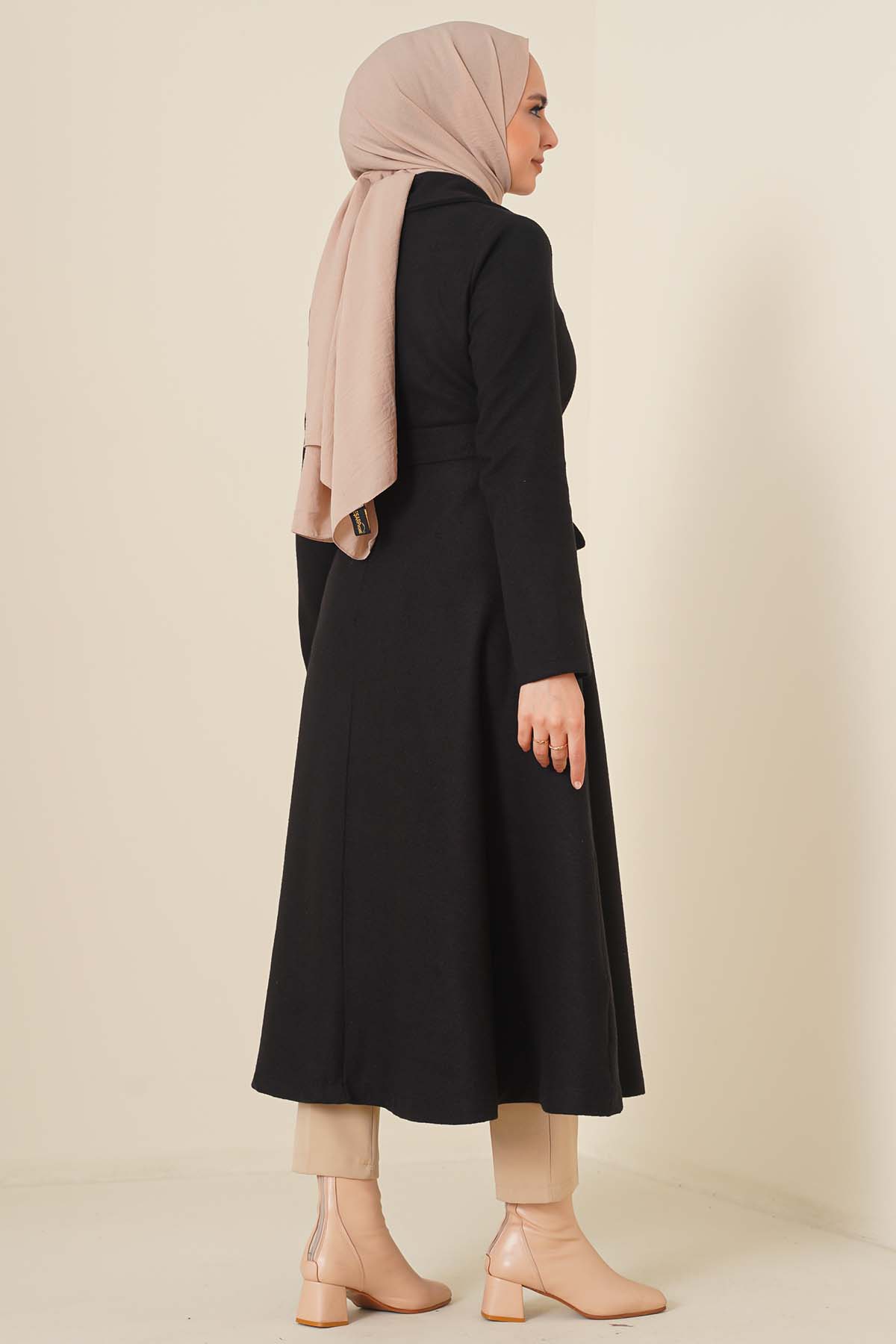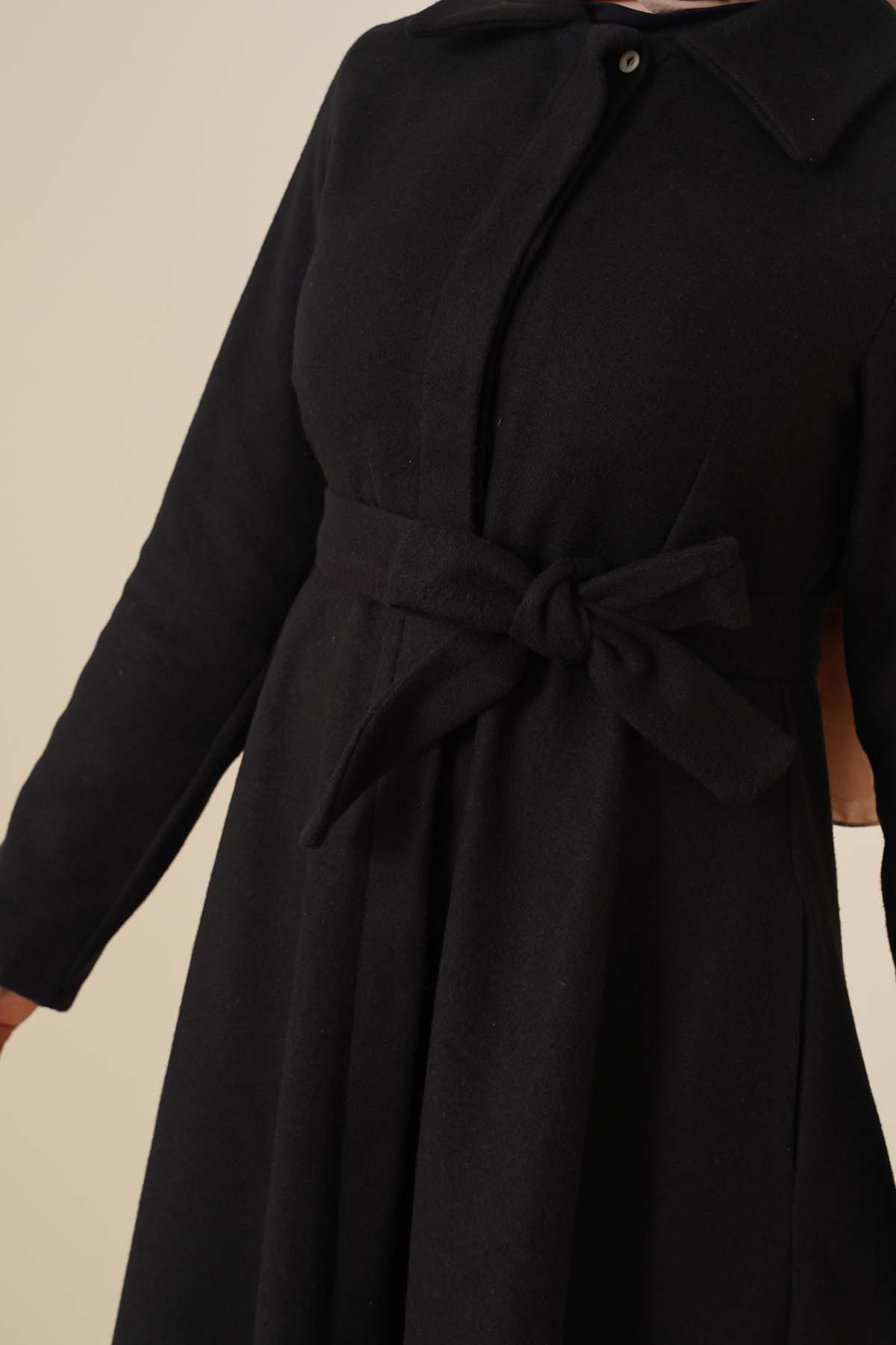 Kuşaklı Gizli Düğmeli Kaban Siyah