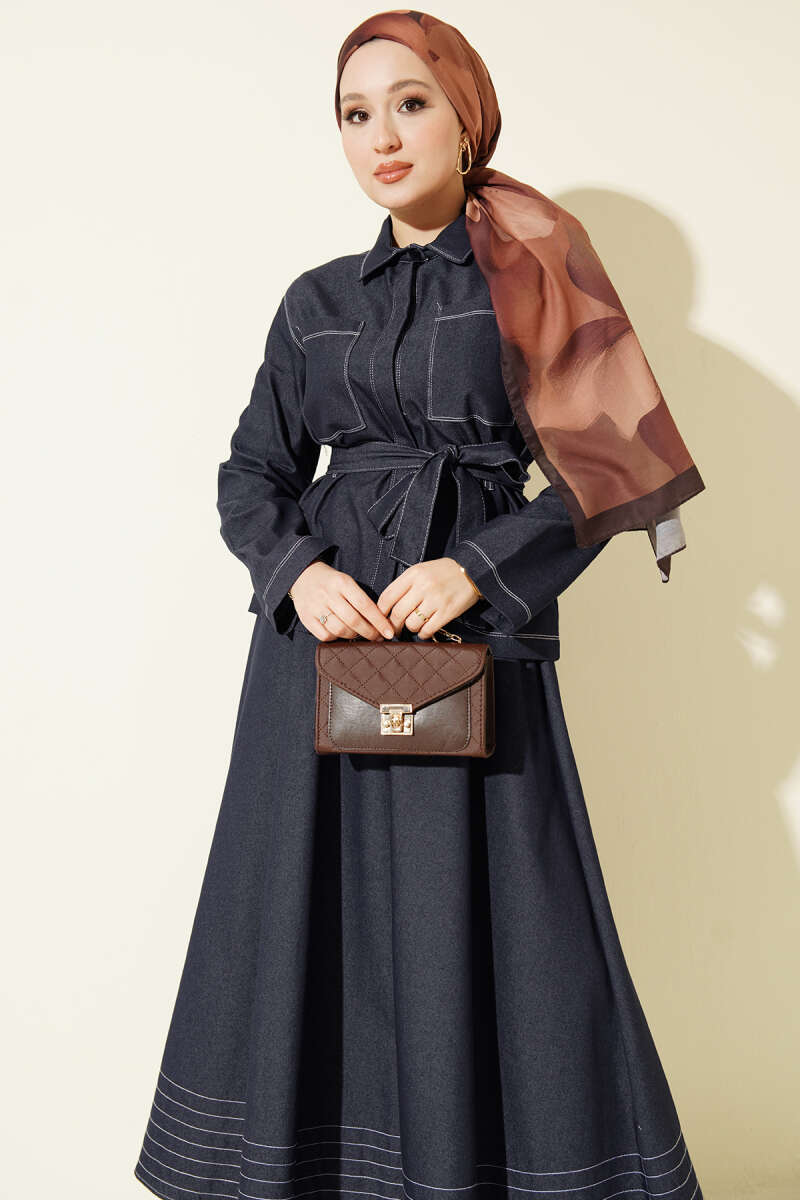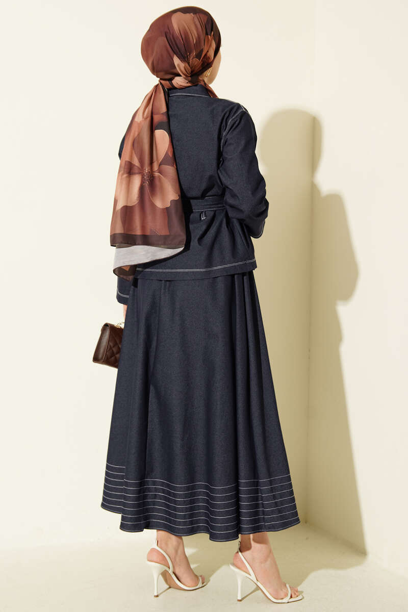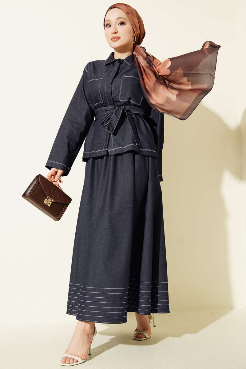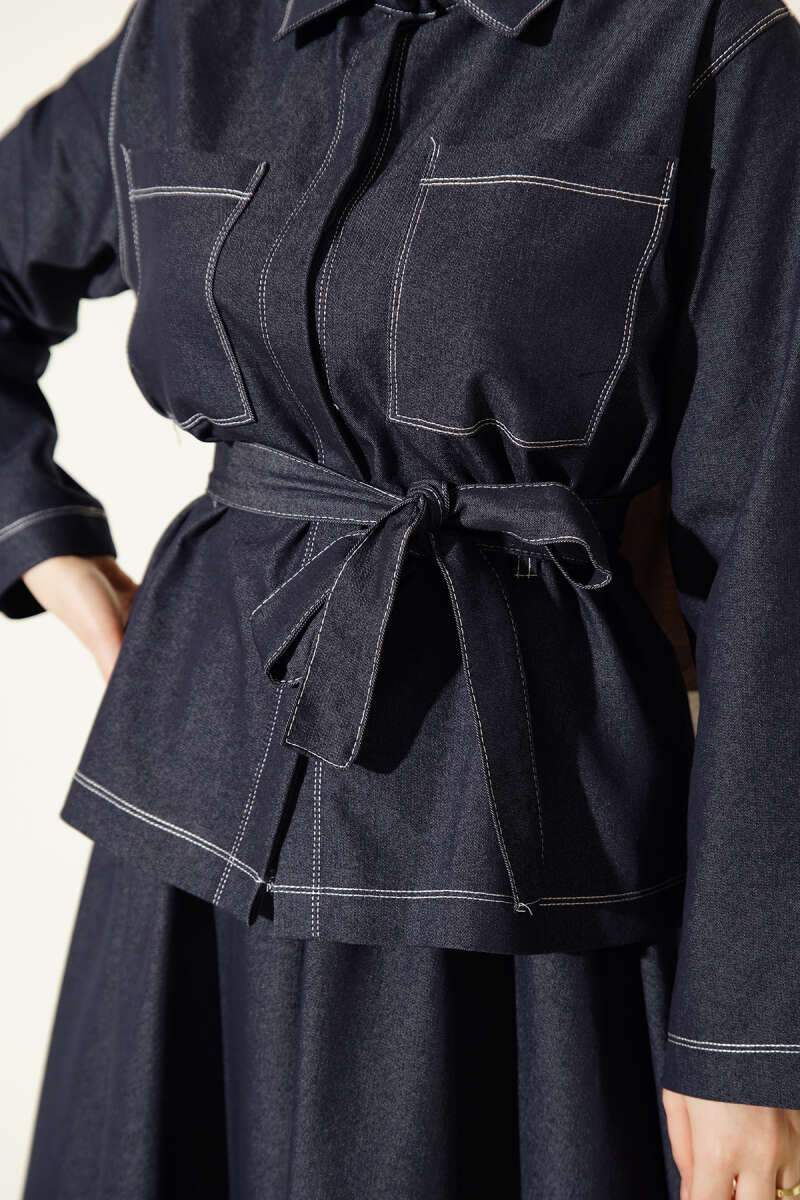Kuşaklı Göğüs Cepli Kot Etekli Takım Lacivert