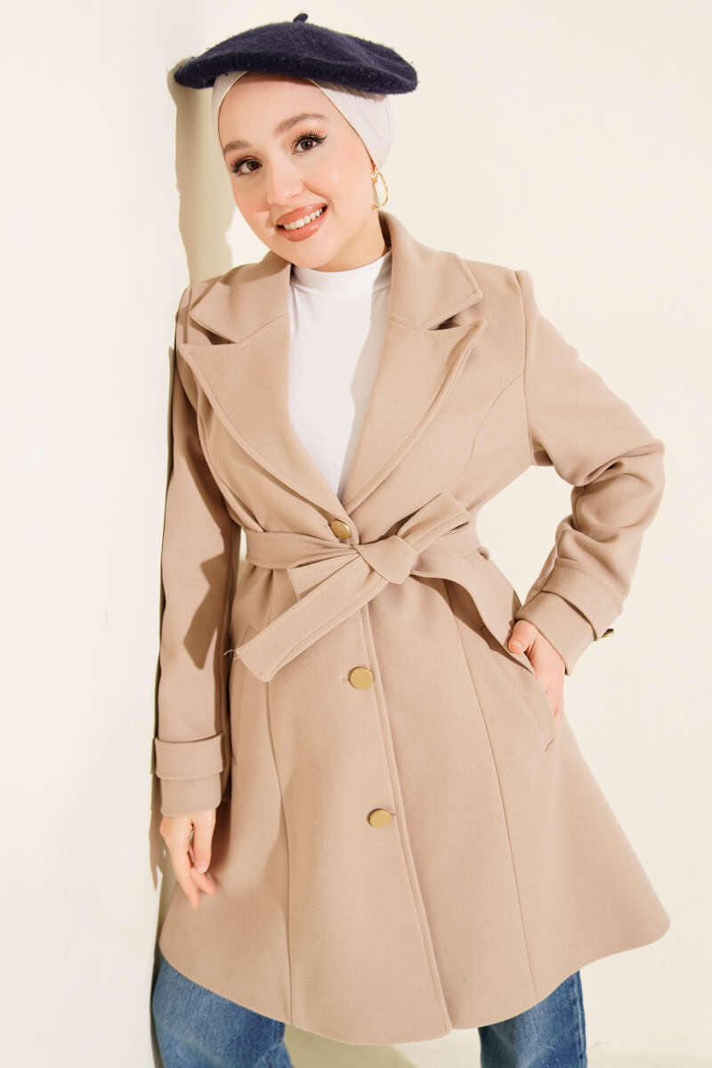 Kuşaklı Gold Düğmeli Kaşe Kaban Taba