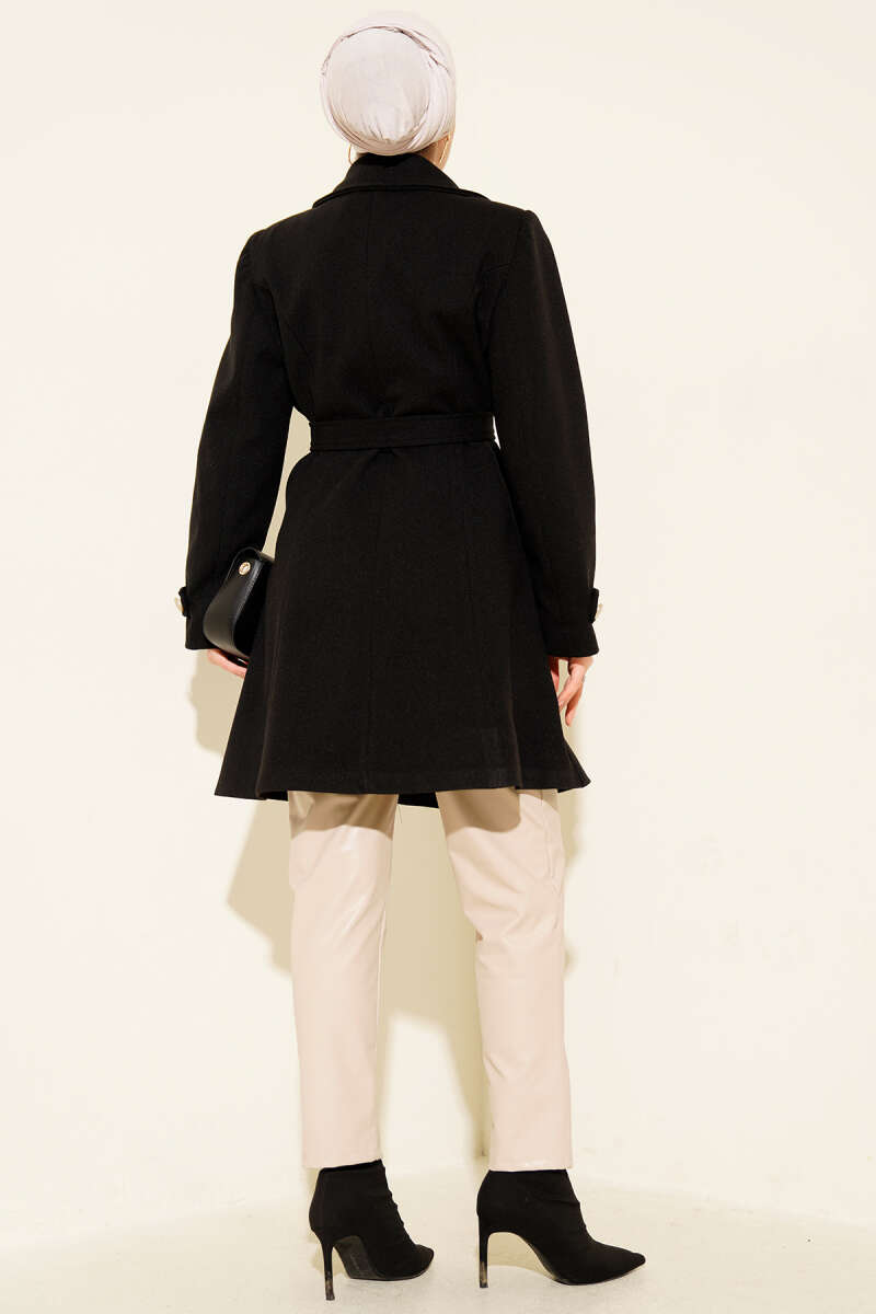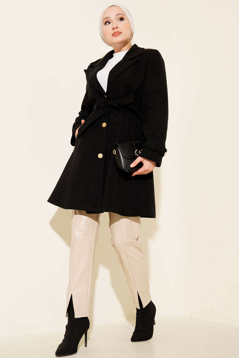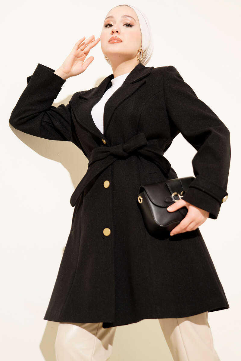 Kuşaklı Gold Düğmeli Kaşe Kaban Taş