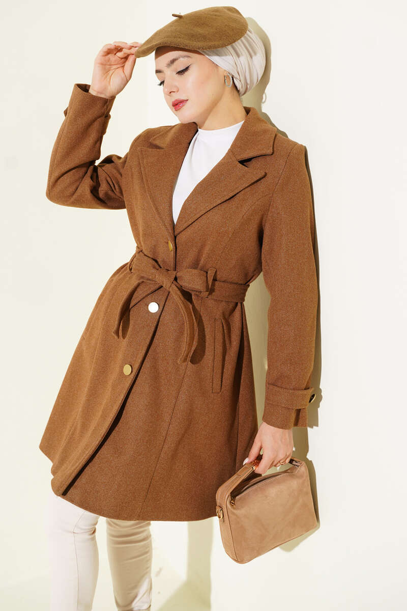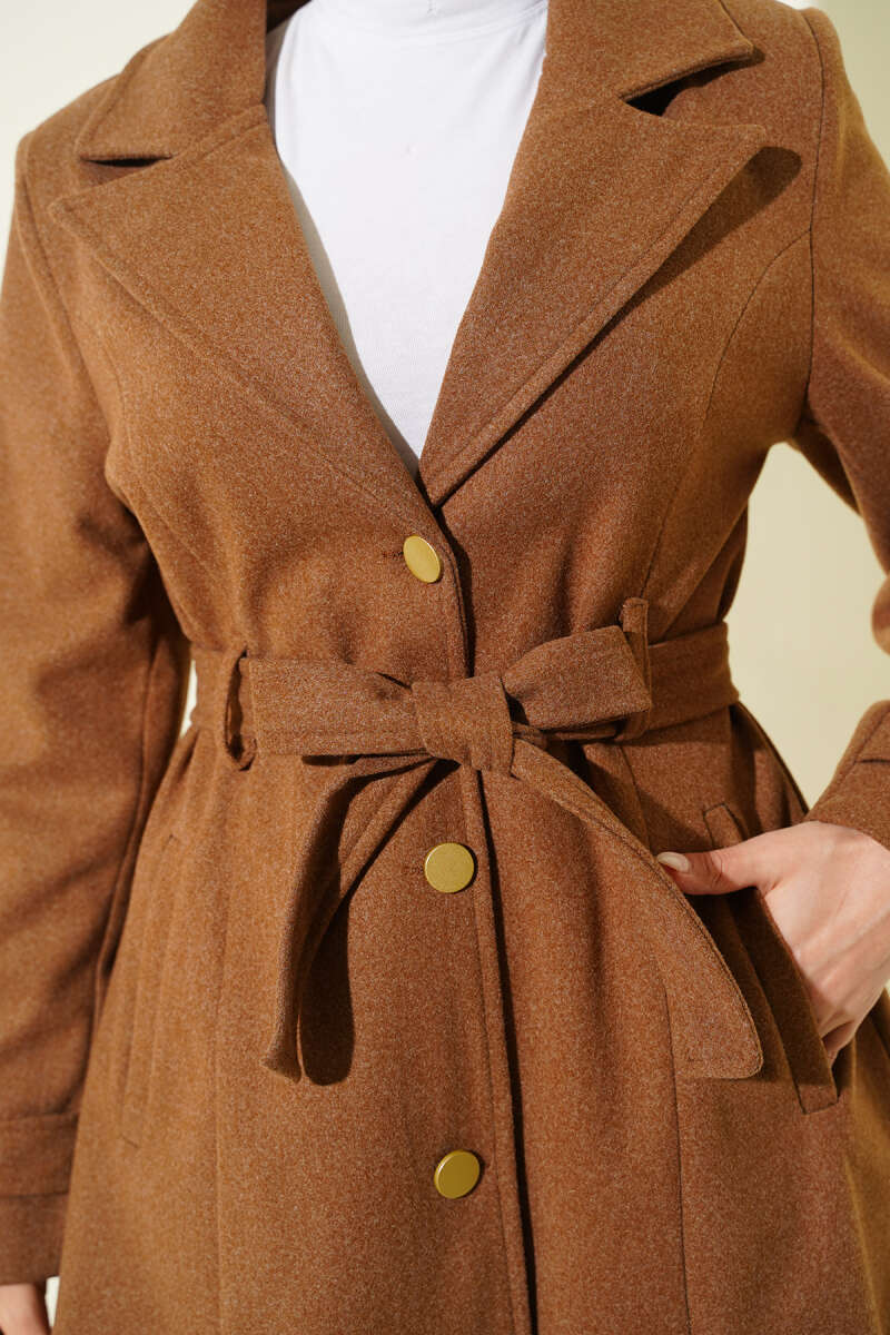 Kuşaklı Gold Düğmeli Kaşe Kaban Taba