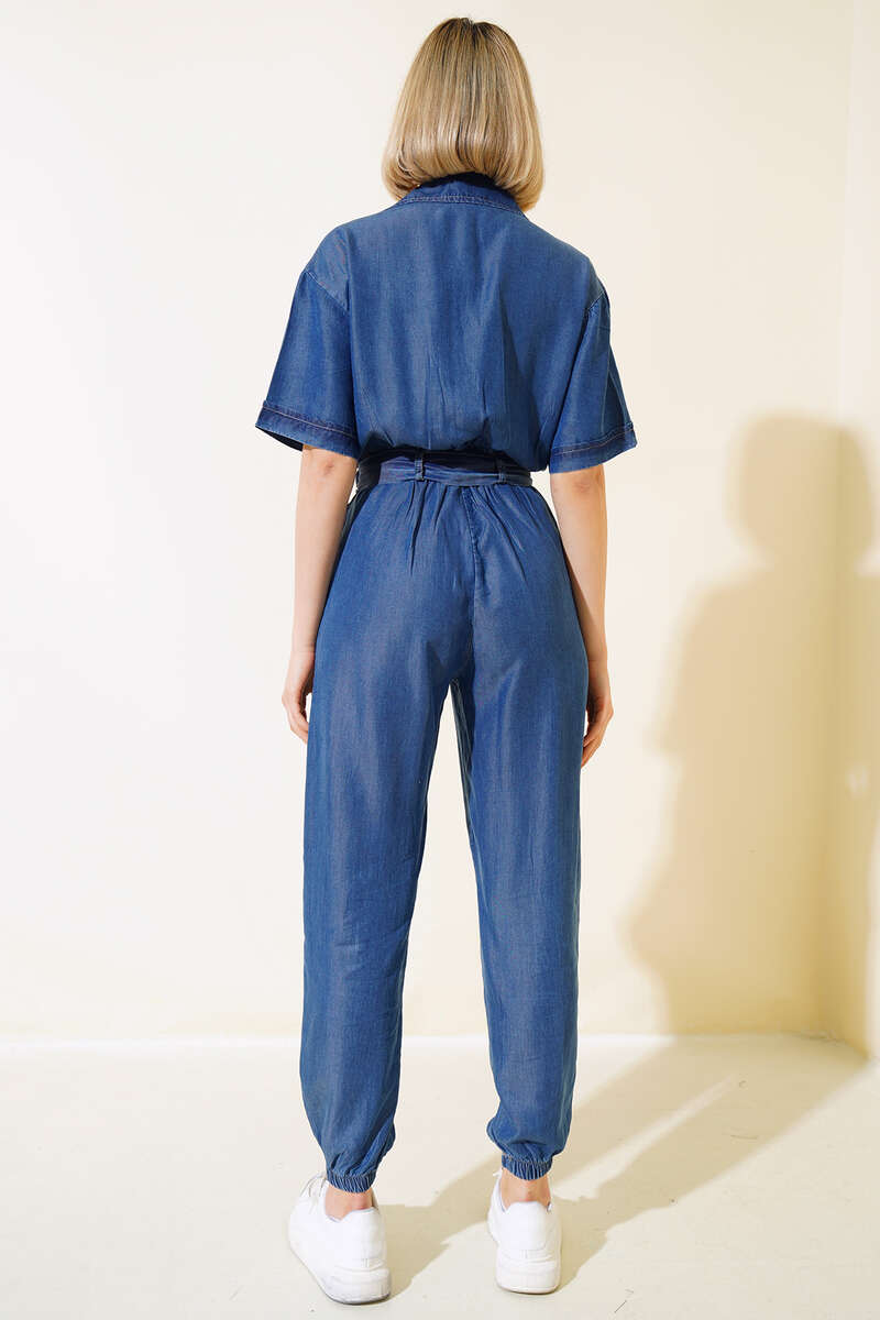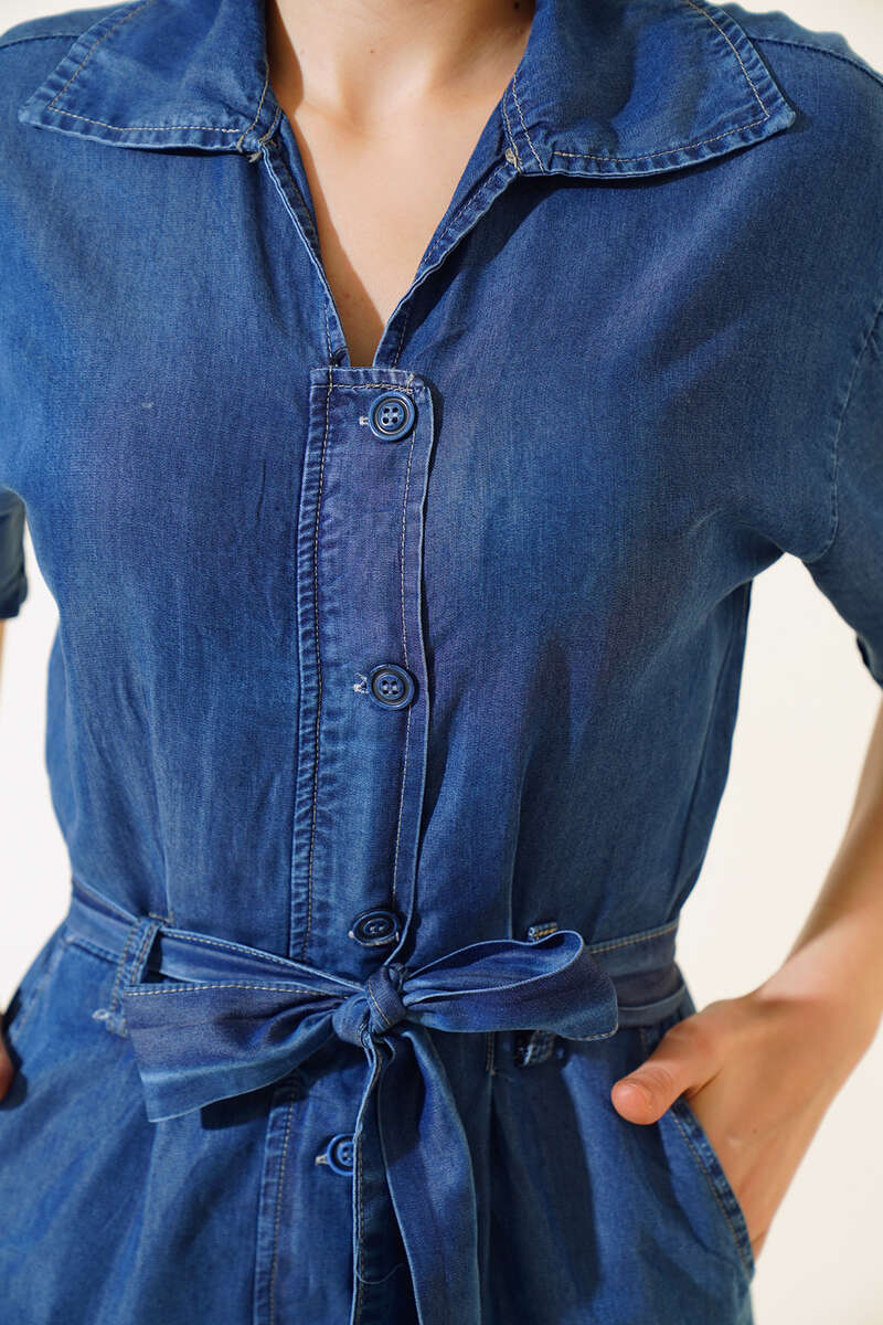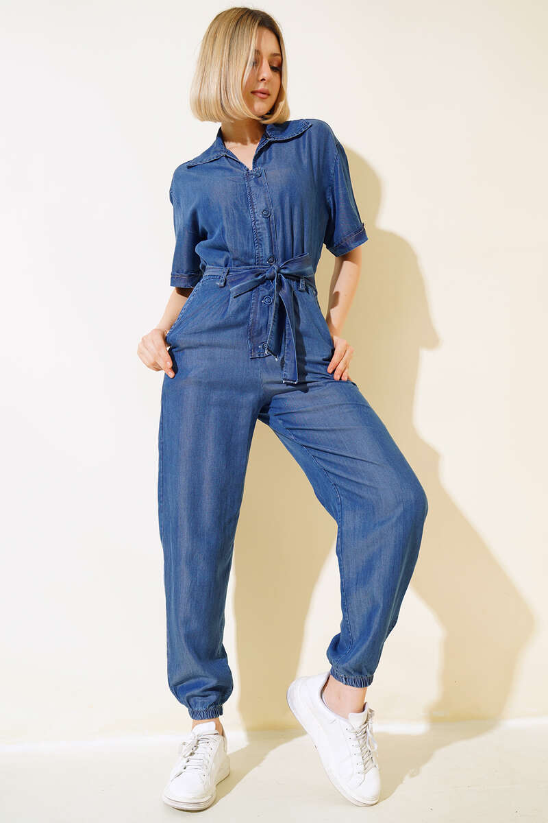 Kuşaklı Gömlek Yaka Kot Tulum Orta Mavi