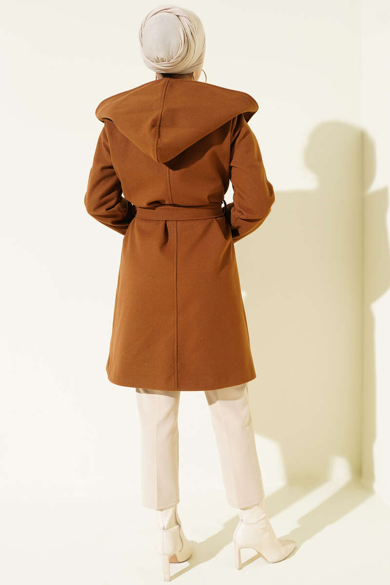 Kuşaklı Kapüşonlu Kaşe Kaban Kahve