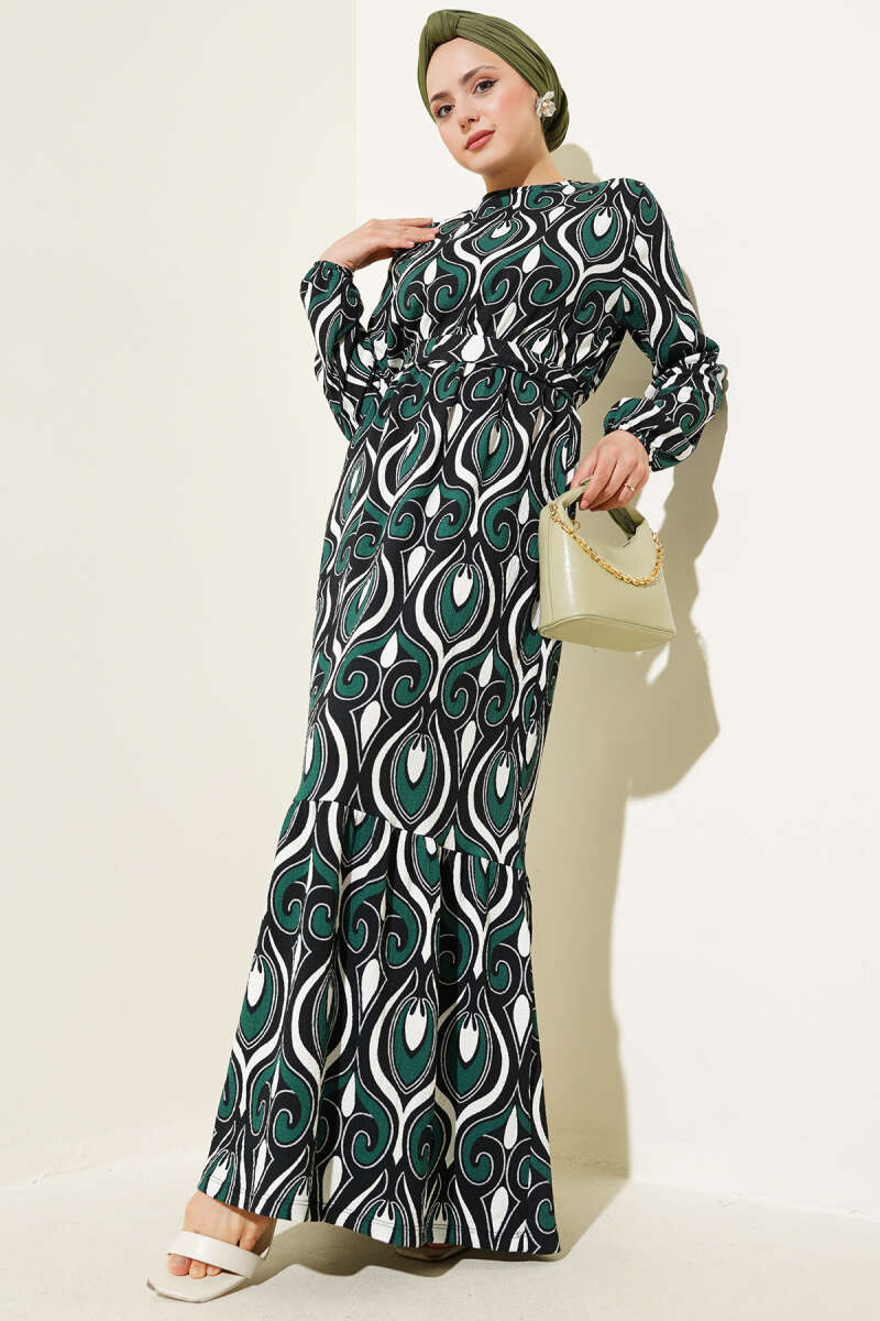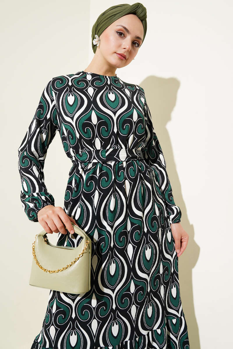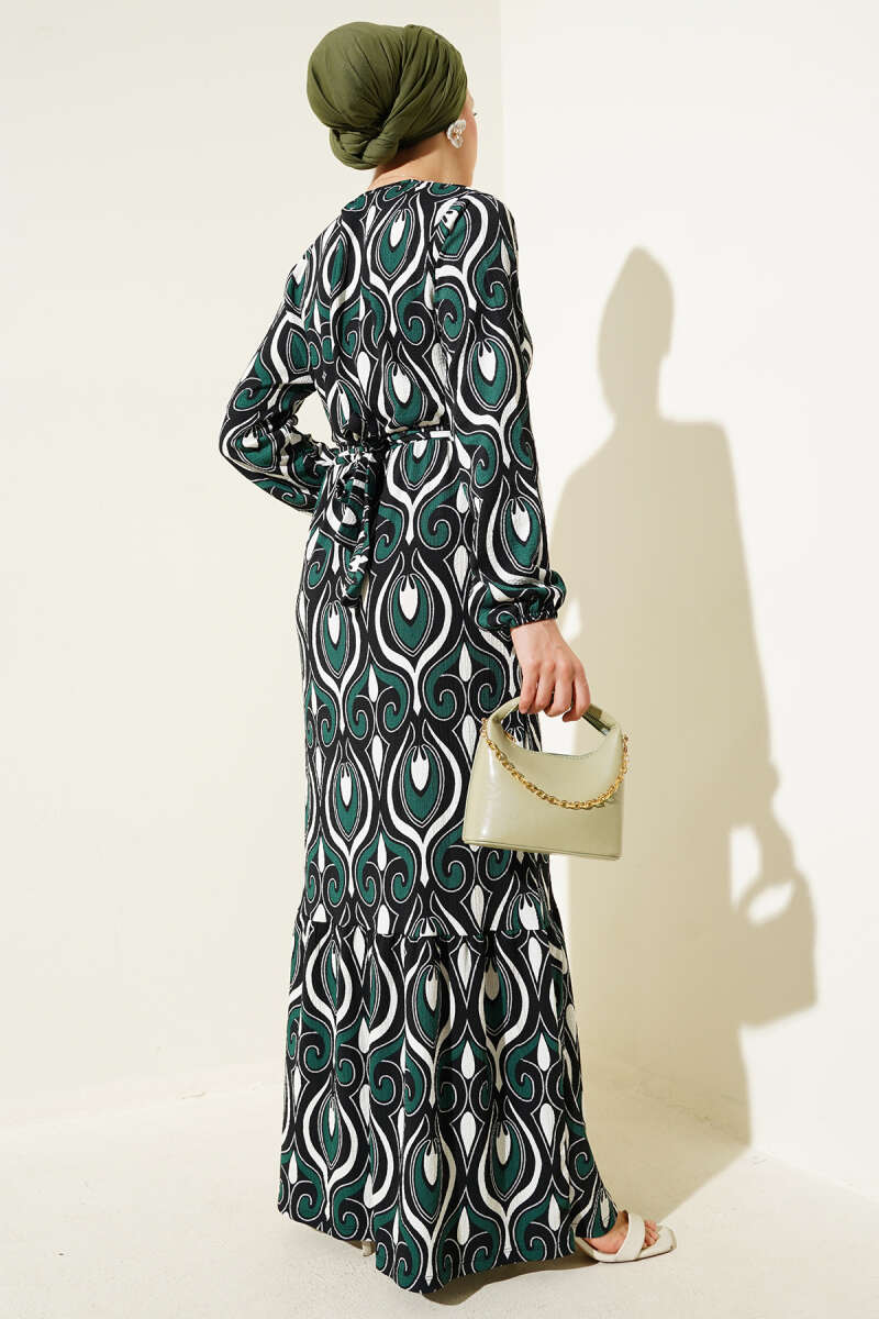 Yarım Düğmeli Balon Kol Kemerli Elbise Kahve