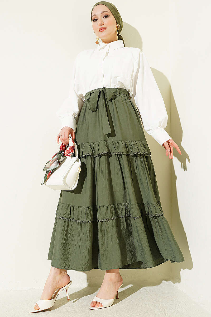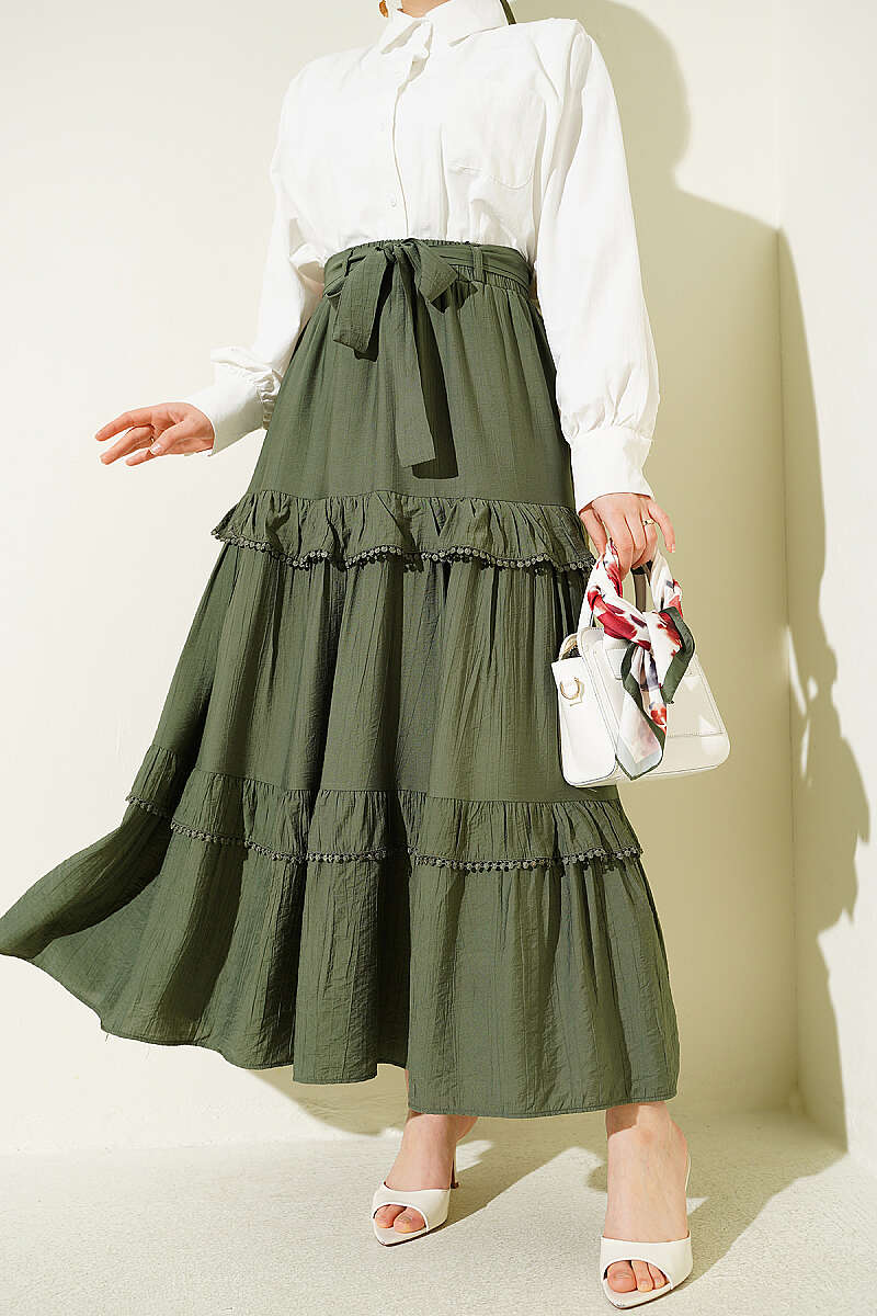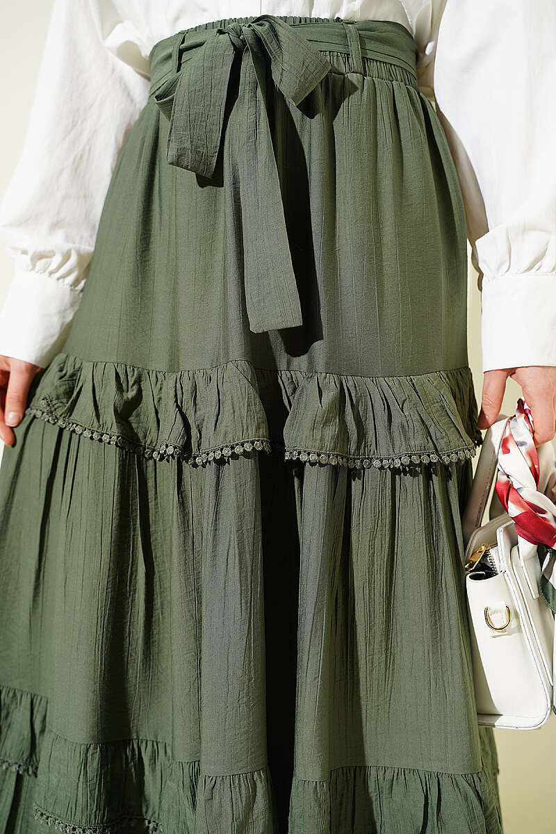 Kuşaklı Kat Detaylı Kloş Etek Haki