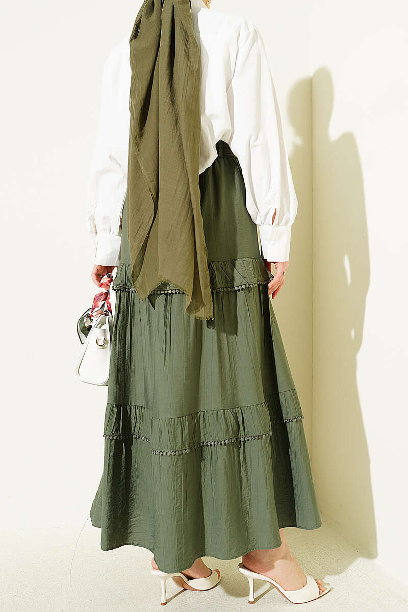 Fırfır Detaylı Beli Lastikli Etek Haki