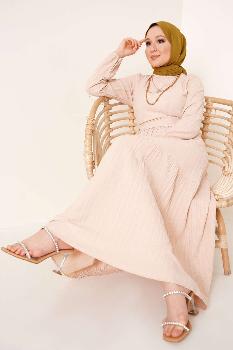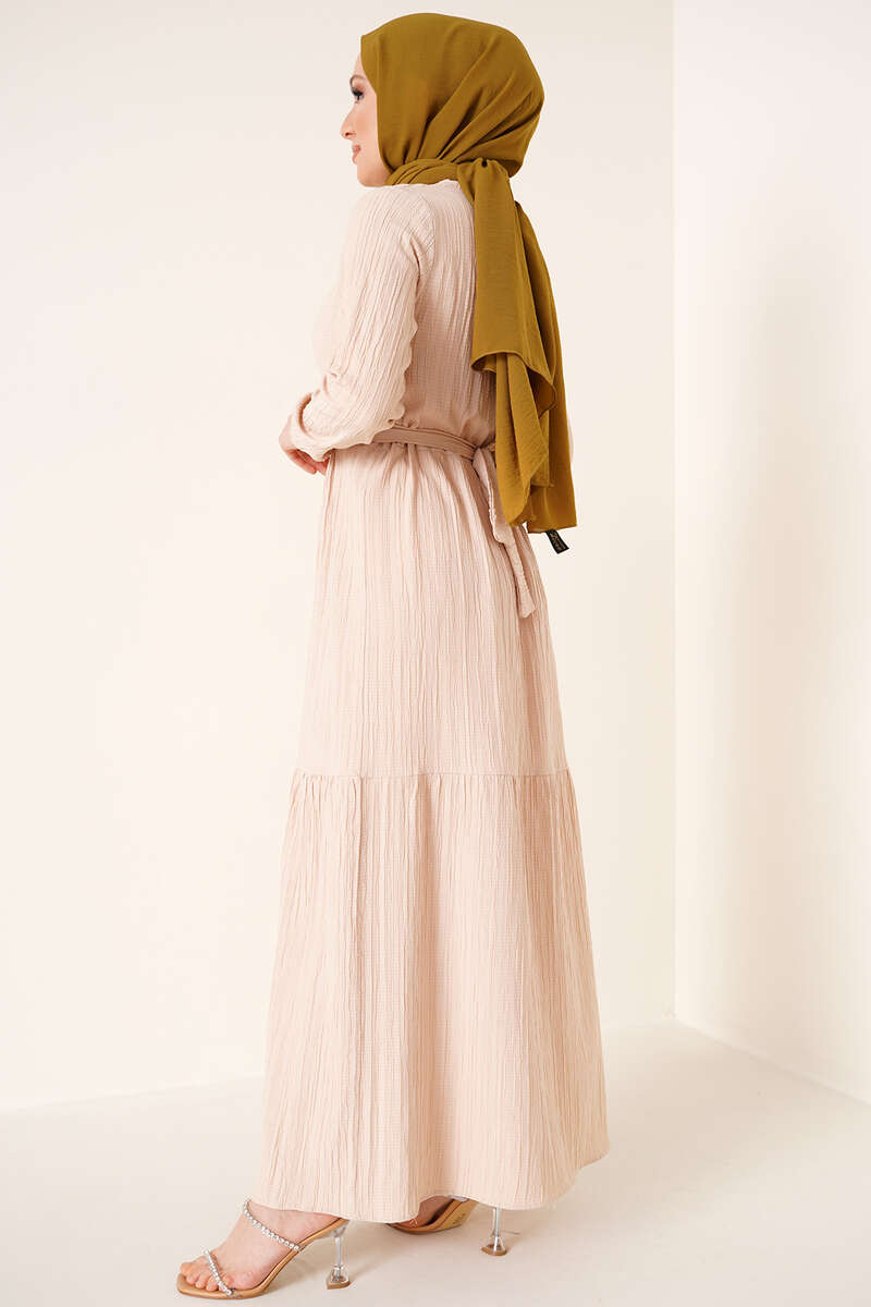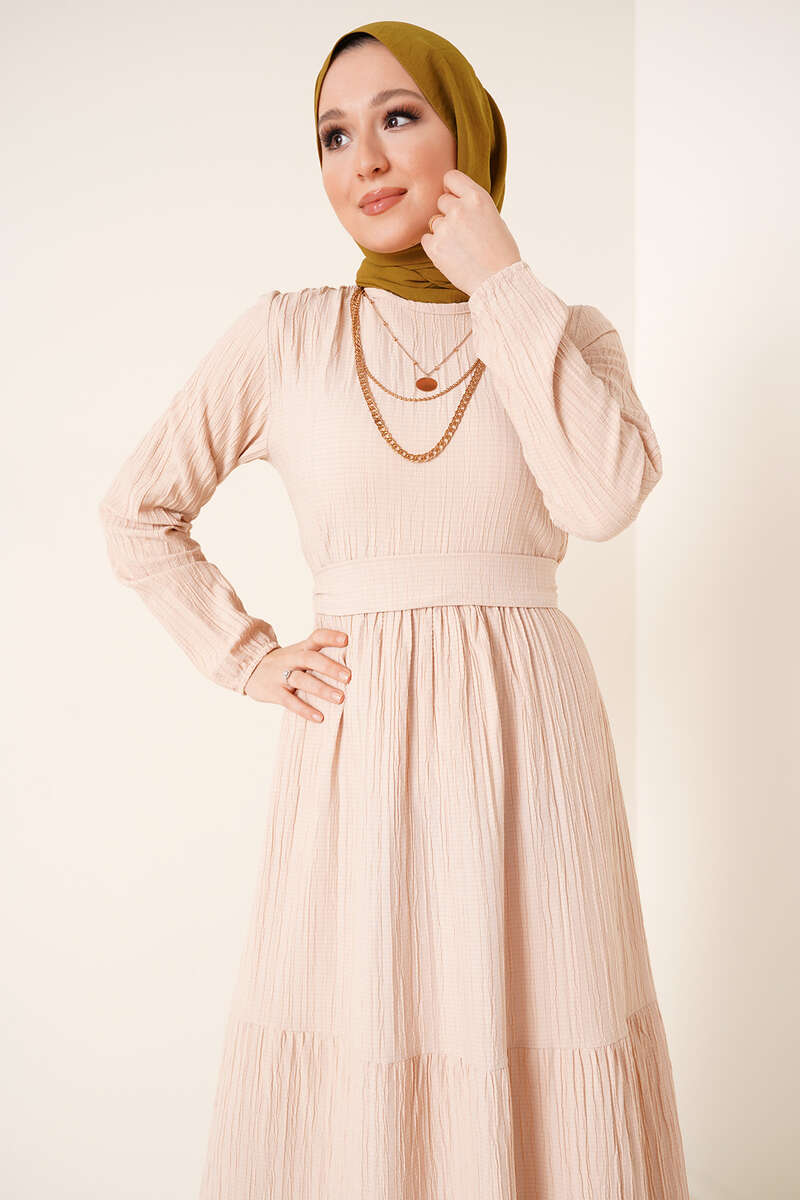 Yeni sezon model elbisemiz dikkat çeken görünümüyle sizlerle buluştu. Elbisemizin bilekleri lastiklidir. Kat kat modellidir. Kuşağı bulunmaktadır. Ensesinde kuş gözü ve düğme vardır. Her ortamda rahatlıkla giyebilirsiniz. Farklı renk seçenekleri mevcuttur.