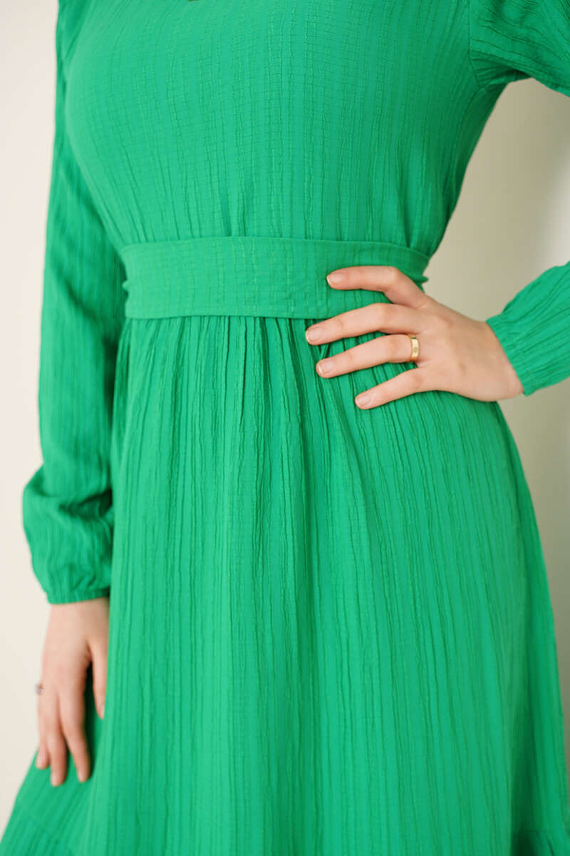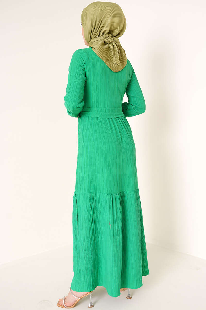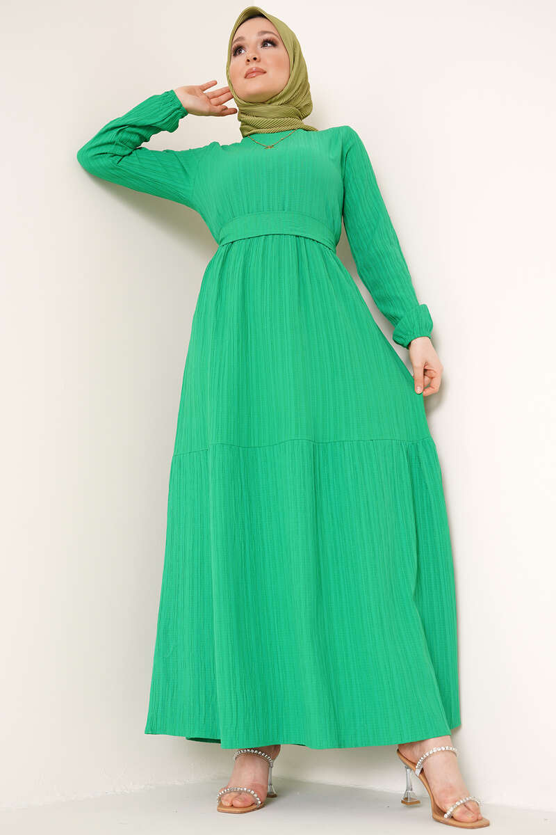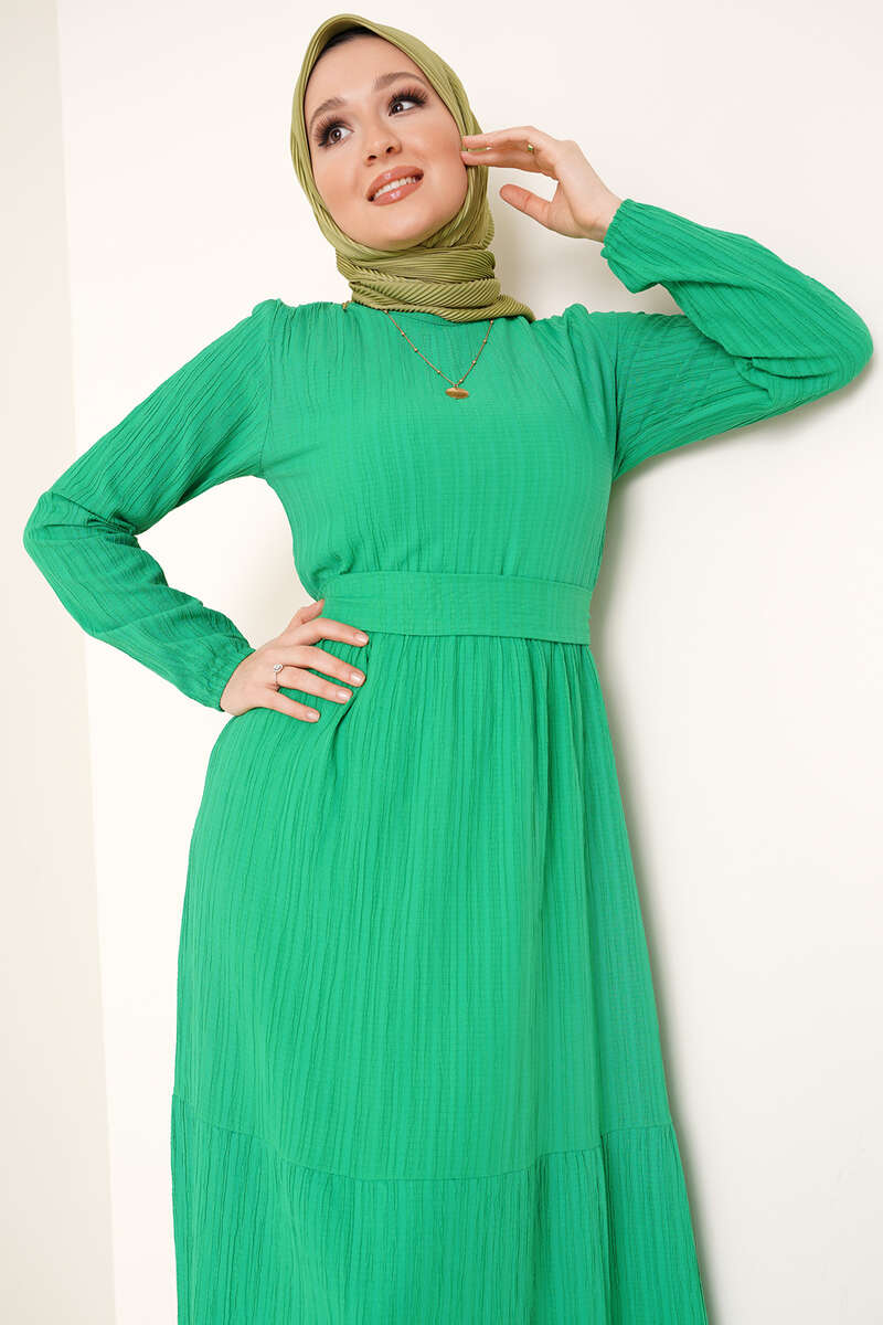 Yeni sezon model elbisemiz dikkat çeken görünümüyle sizlerle buluştu. Elbisemizin bilekleri lastiklidir. Kat kat modellidir. Kuşağı bulunmaktadır. Ensesinde kuş gözü ve düğme vardır. Her ortamda rahatlıkla giyebilirsiniz. Farklı renk seçenekleri mevcuttur.