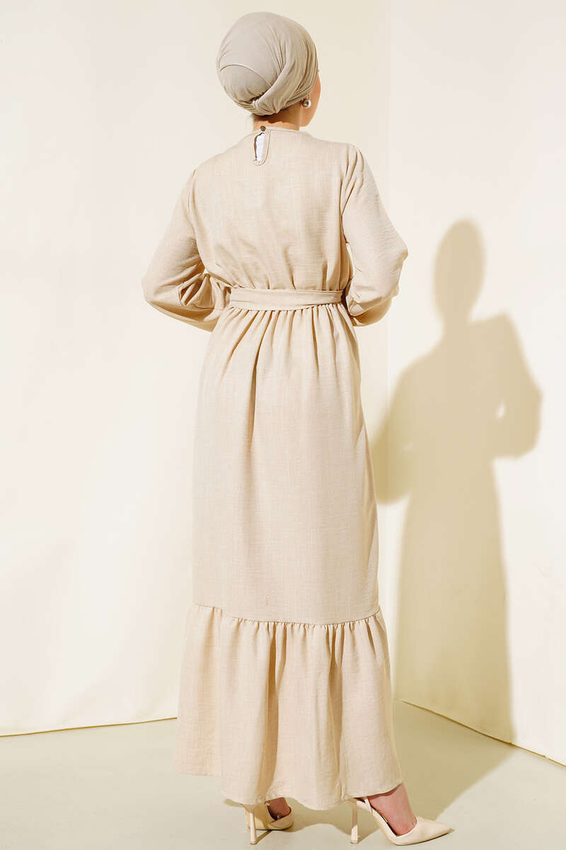 Yeni sezon elbisemiz sizlerle beraber. Elbisemizin beli ve kol bilekleri lastiklidir. Yakası düğmelidir. Etek ucu katlıdır. Kendi kumaşından kuşağı vardır.  Elbisemizi rahat ve şık duruşuyla çok beğeneceksiniz. Renk seçeneklerimiz mevcuttur. Broş Aksesuar Olarak Kullanılmıştır.