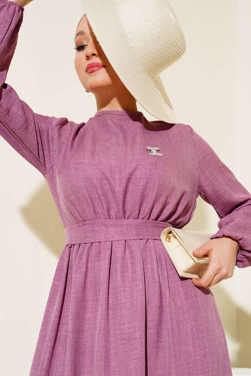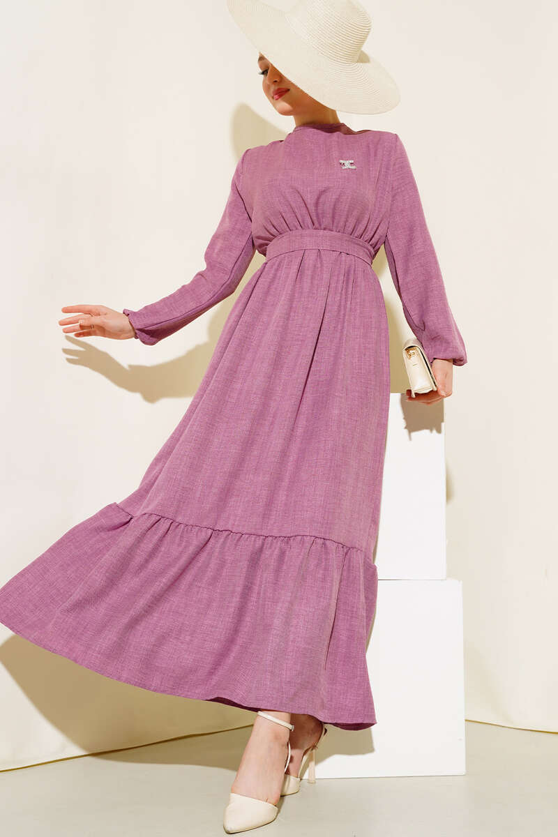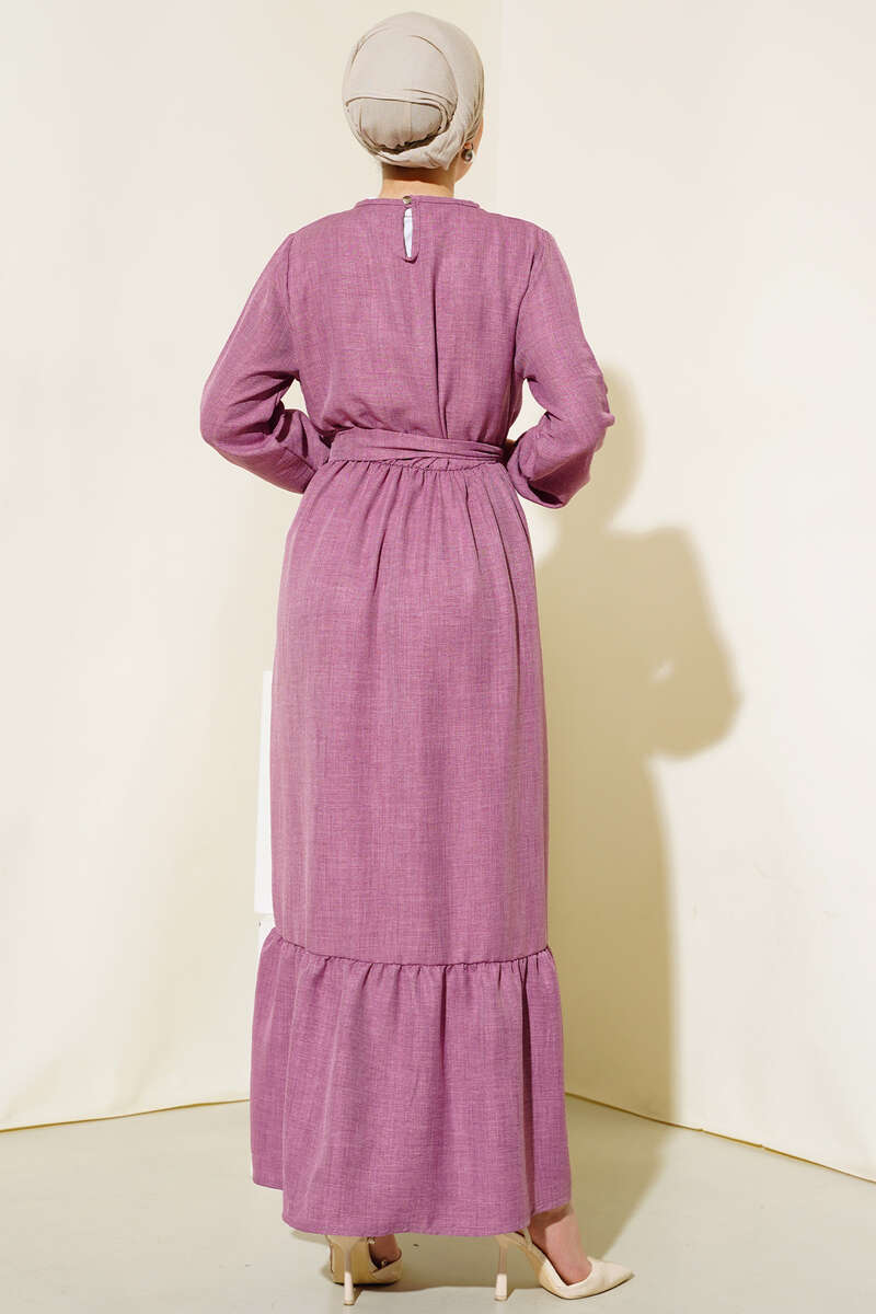 Kuşaklı Kat Keten Elbise Gül Kurusu