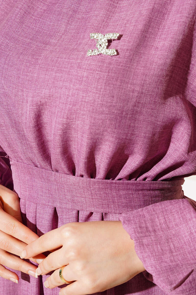 Yeni sezon elbisemiz sizlerle beraber. Elbisemizin beli ve kol bilekleri lastiklidir. Yakası düğmelidir. Etek ucu katlıdır. Kendi kumaşından kuşağı vardır.  Elbisemizi rahat ve şık duruşuyla çok beğeneceksiniz. Renk seçeneklerimiz mevcuttur. Broş Aksesuar Olarak Kullanılmıştır.