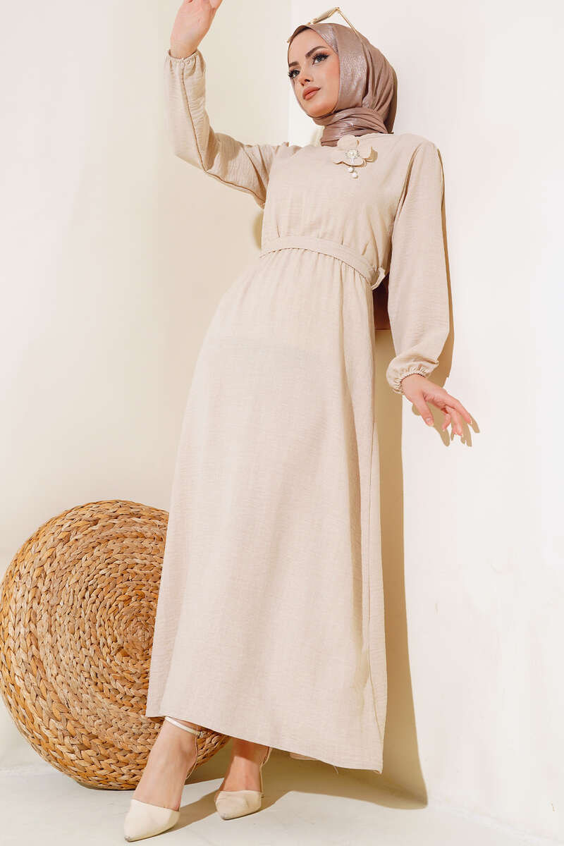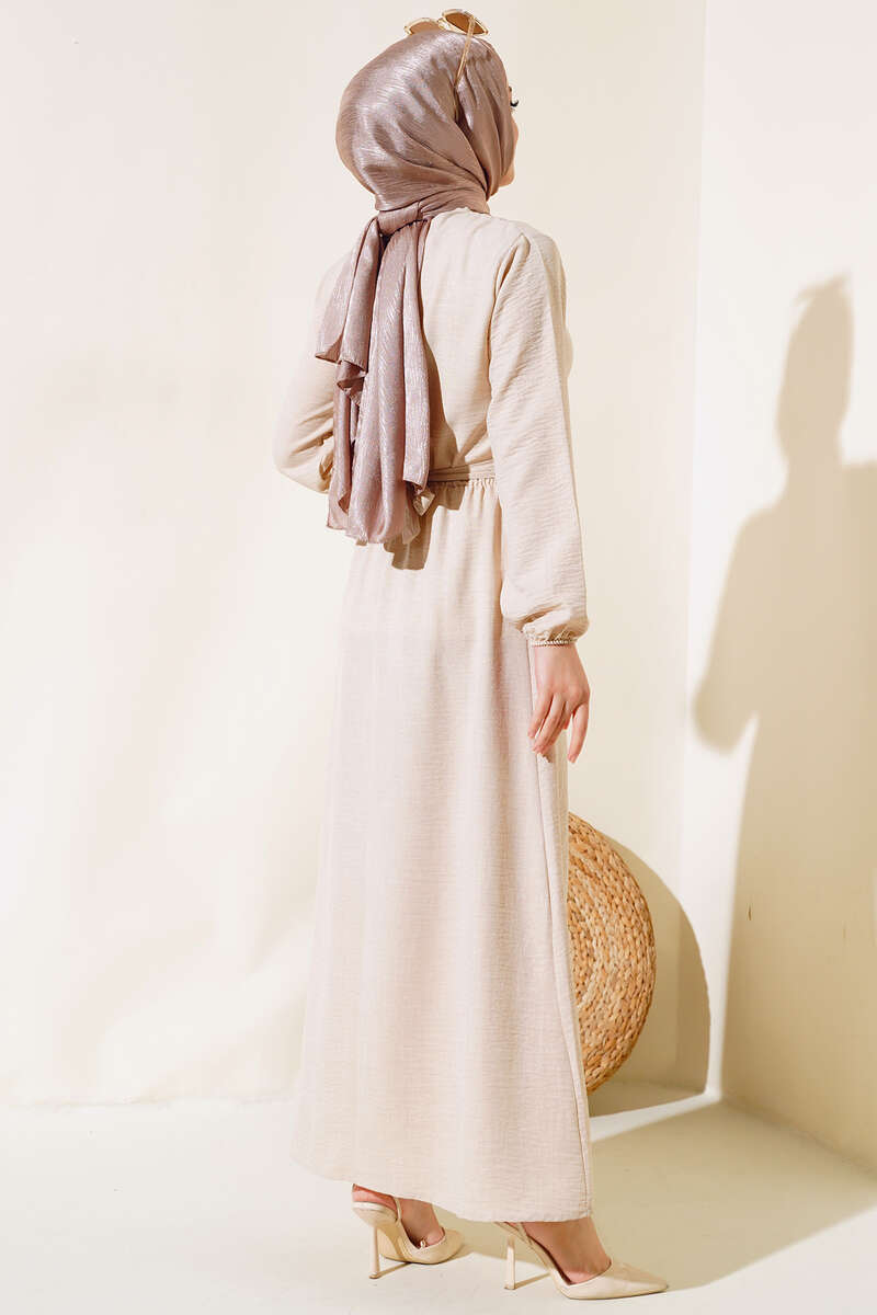 Yeni sezon elbisemiz sizlerle beraber. Elbisemizin beli ve kol bilekleri lastiklidir. Belden kuşak bağlamalıdır. Kloş moel olan elbisemize keten kumaştır. İki adet kemer köprüsü bulunmaktadır. Şık elbisemizin renk seçenekleri mevcuttur.