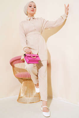 Yeni sezon ikili takım modelimiz sizlerle beraber. Tuniğimiz boydan düğmelidir. Klasik yakadır. Kol bilekleri manşetli ve düğmelidir. Kendi kumaşından kuşağı vardır. Pantolonumuzun beli lastiklidir. Bol paçadır. Cepsiz modeldir.
