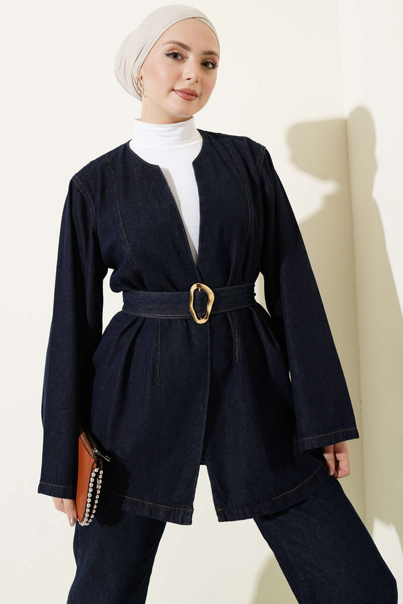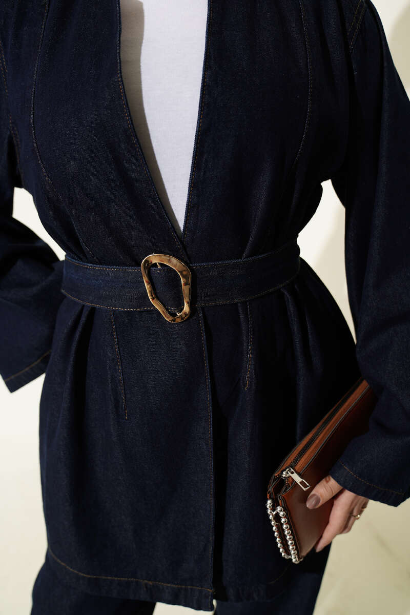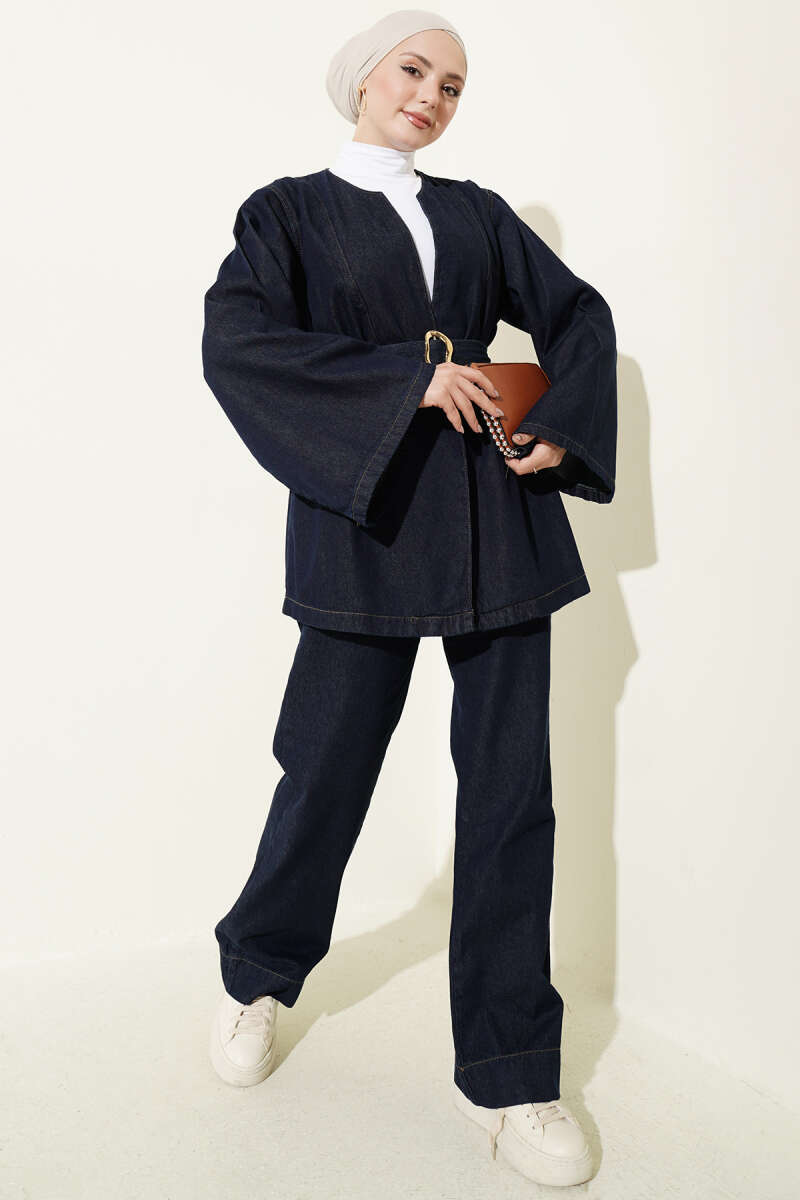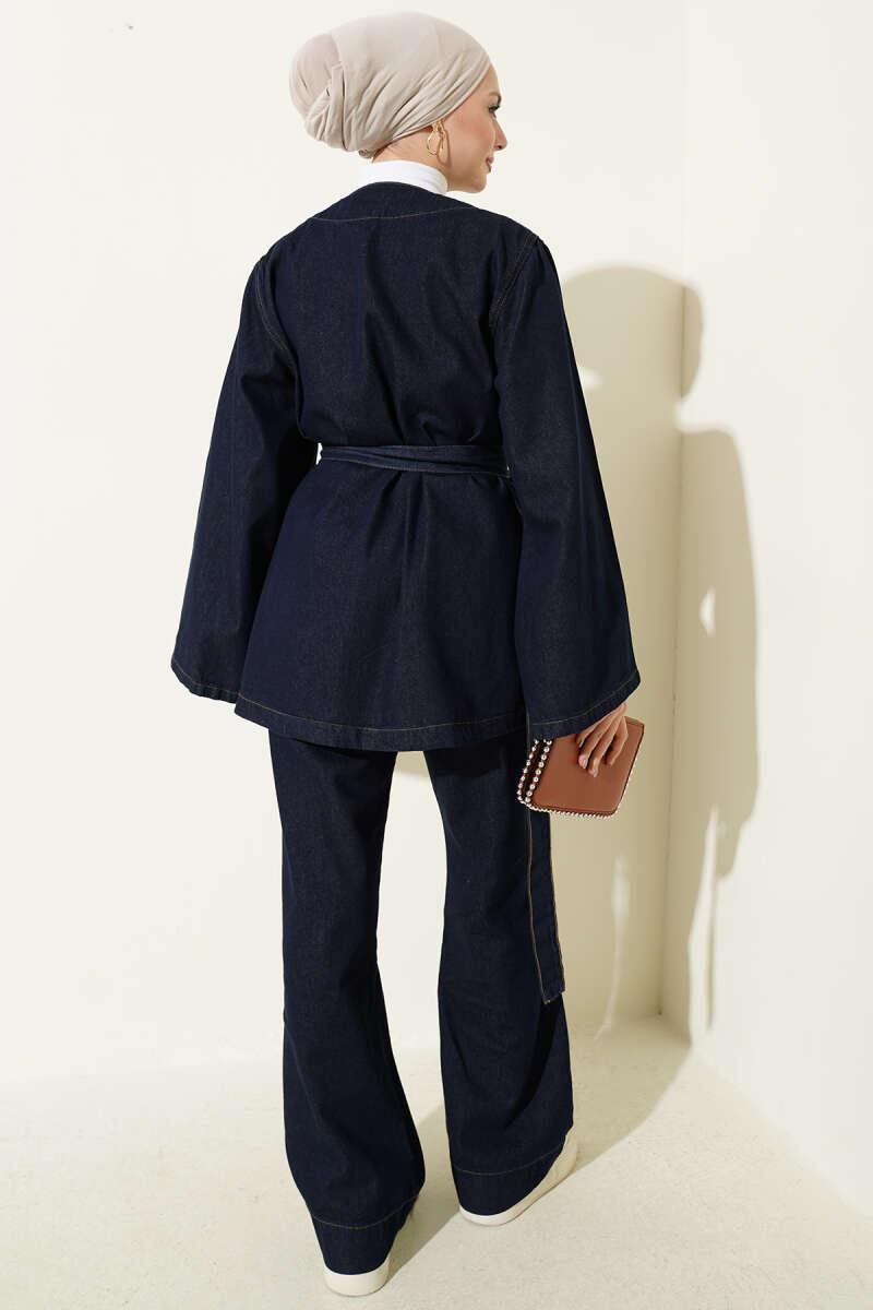 Kuşaklı Kimonolu Kot İkili Takım Lacivert