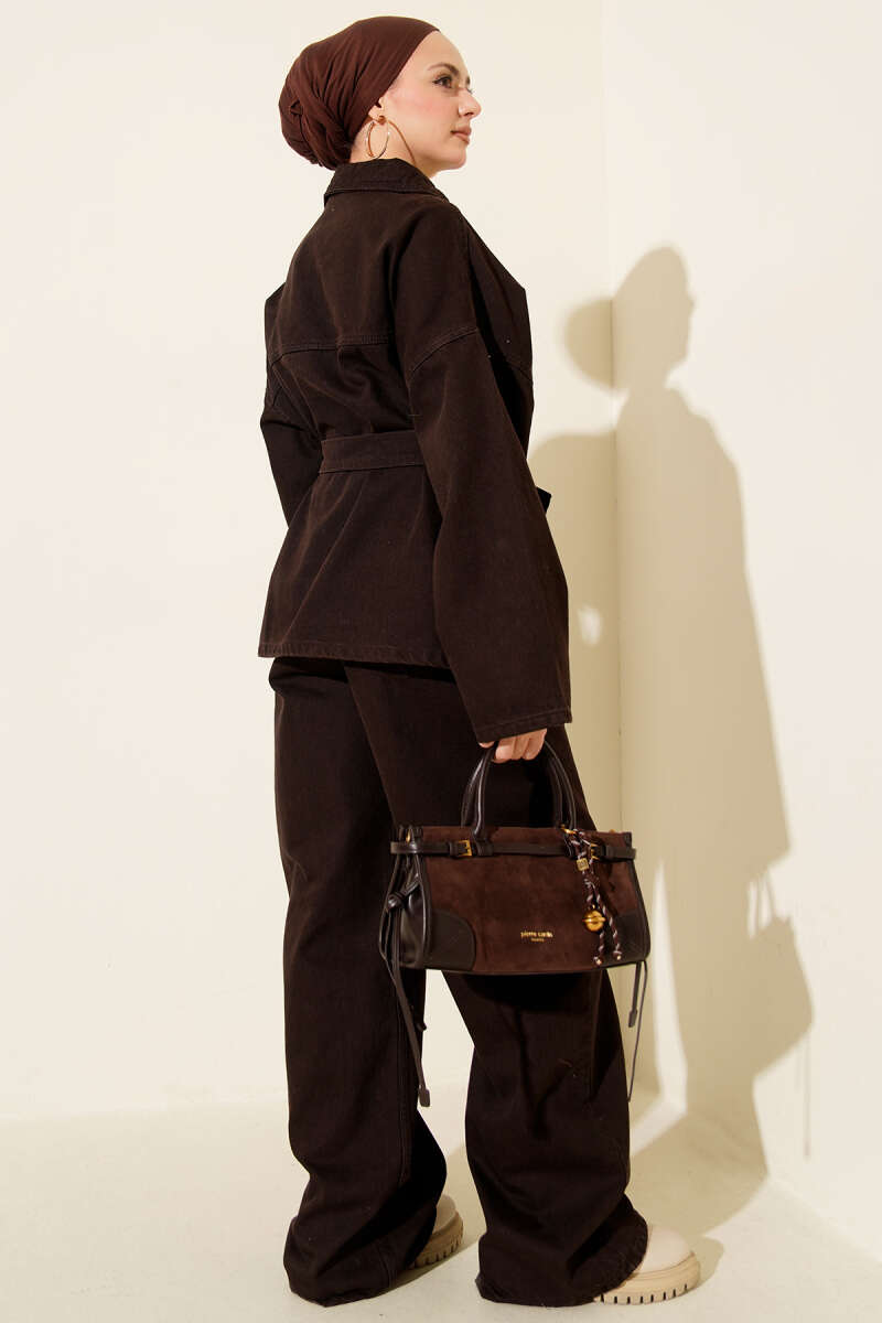 Düğmeli Uzun Merserize Hırka Kahve