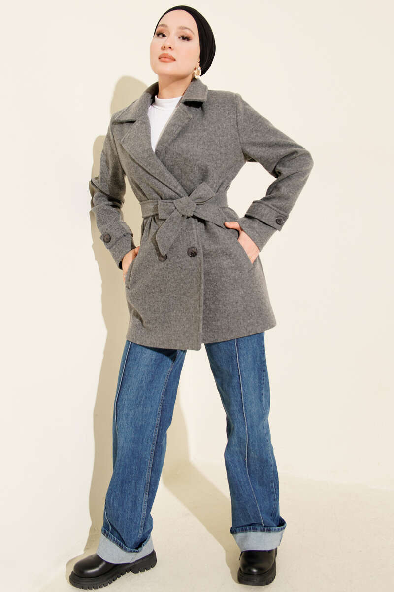 Kuşaklı Kruvaze Yaka Kısa Kaşe Kaban Gri