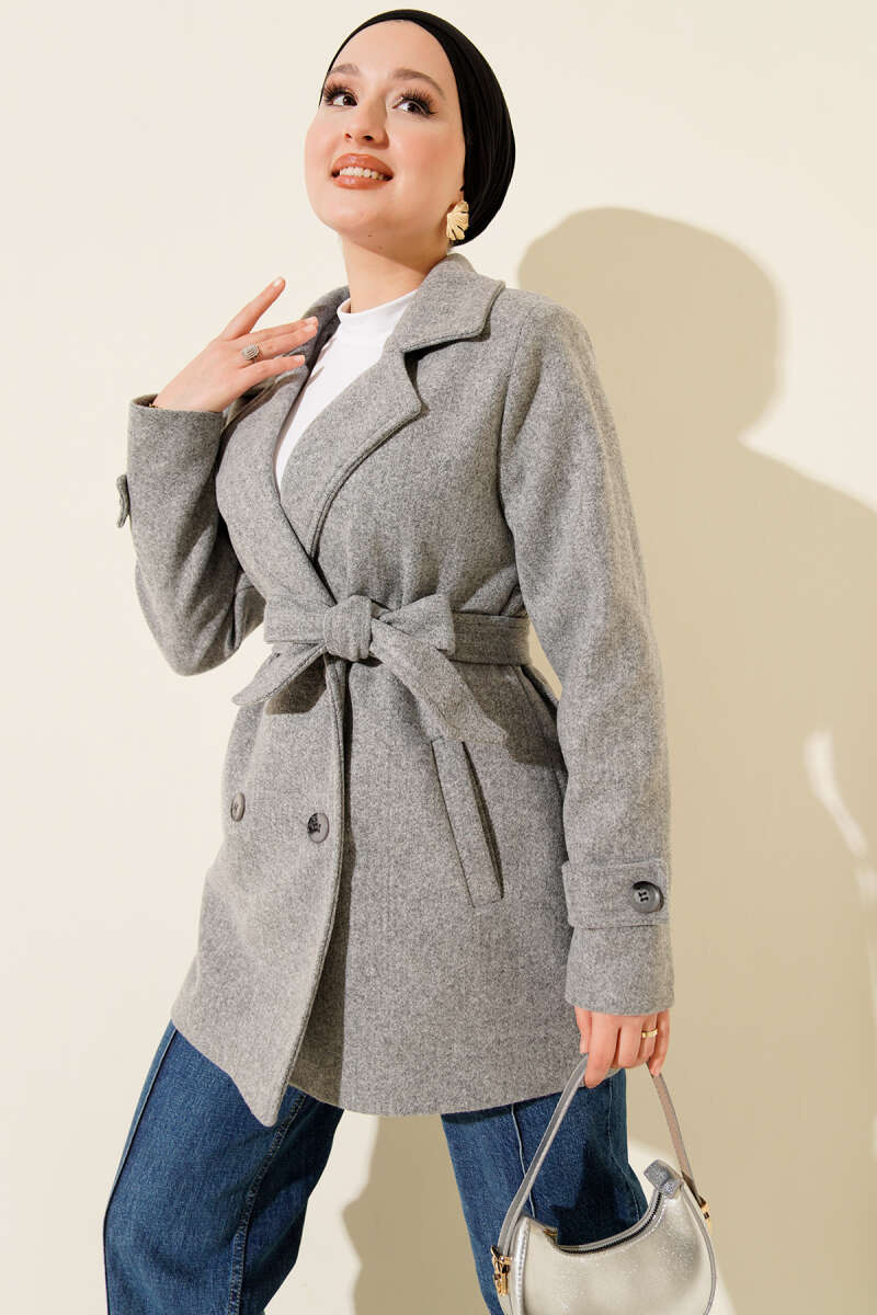 Kuşaklı Kruvaze Yaka Kısa Kaşe Kaban Füme