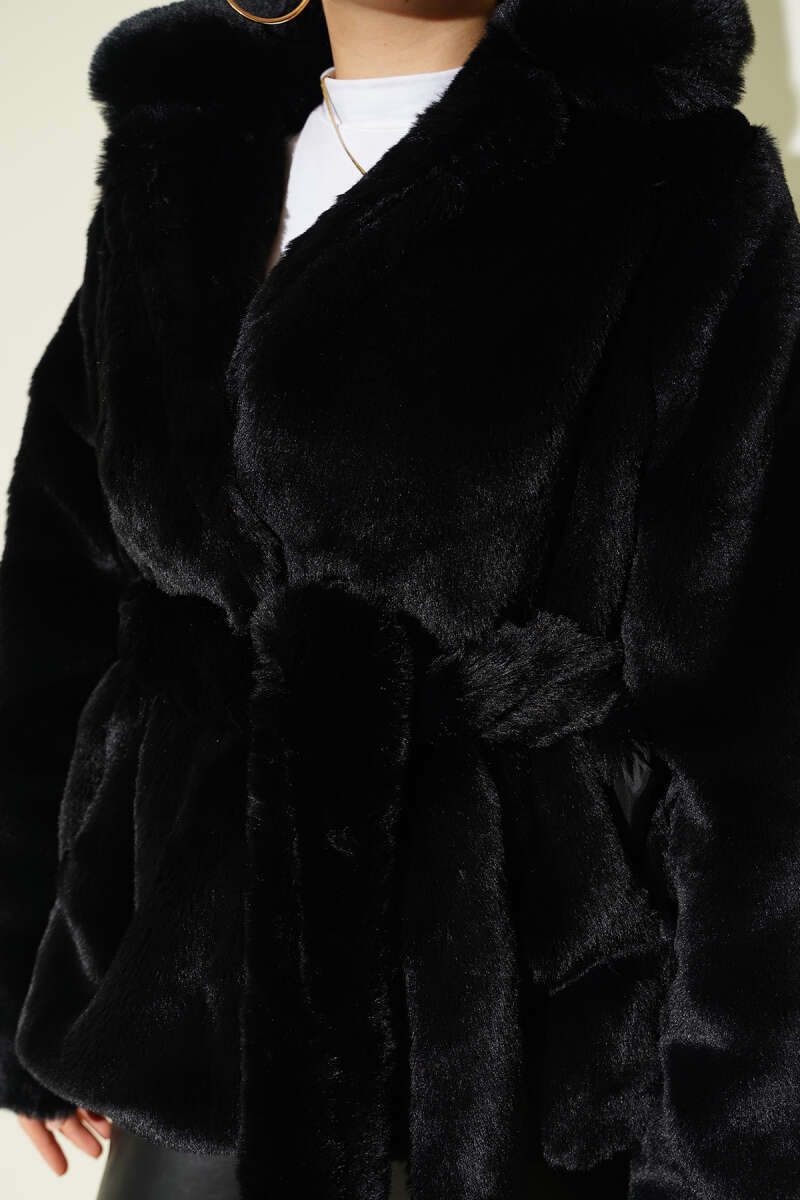 Kuşaklı Kruvaze Yaka Kürk Mont Kahve