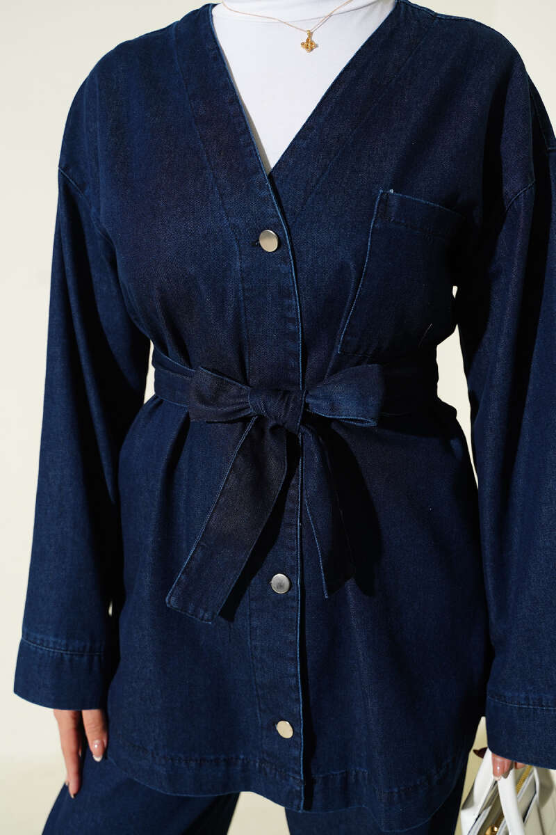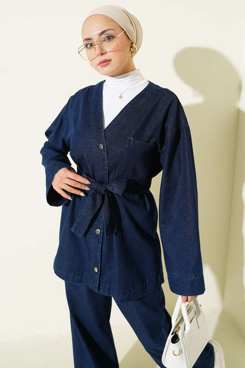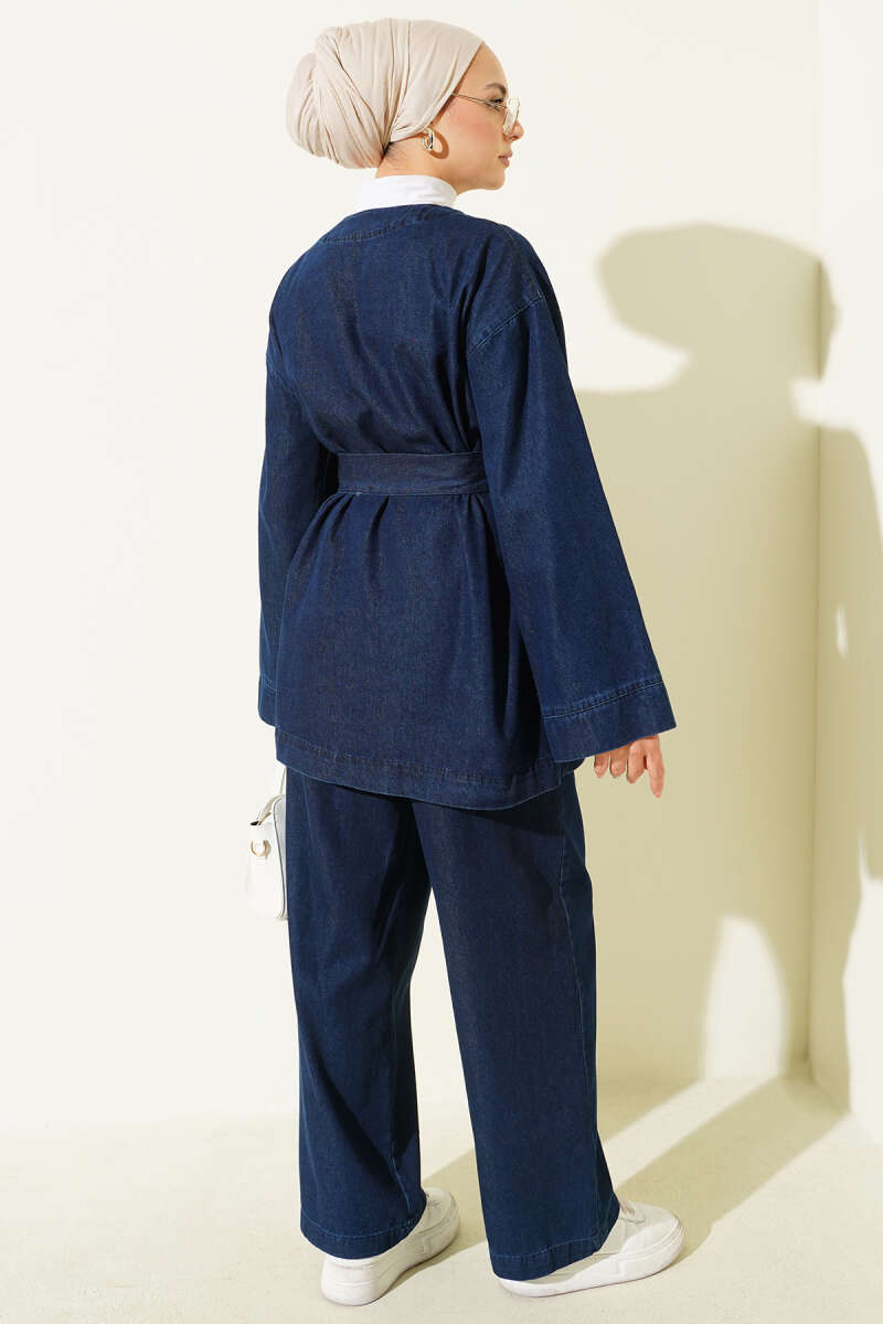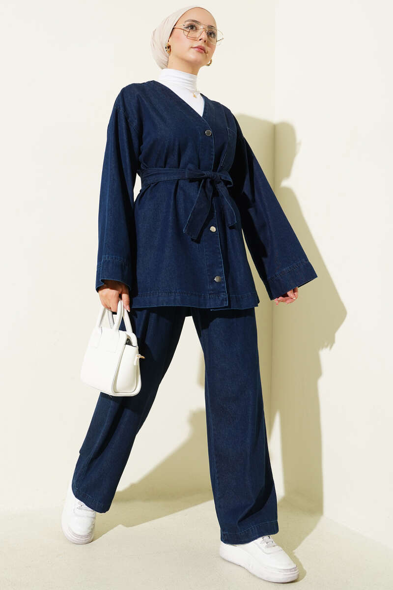 Kuşaklı Metal Düğmeli Kot İkili Takım Siyah