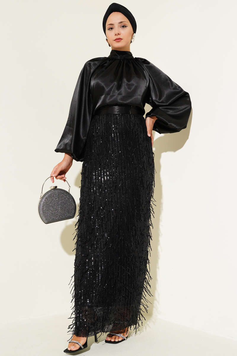 Bilek Bağlamalı Kuşaklı Abiye Elbise Siyah