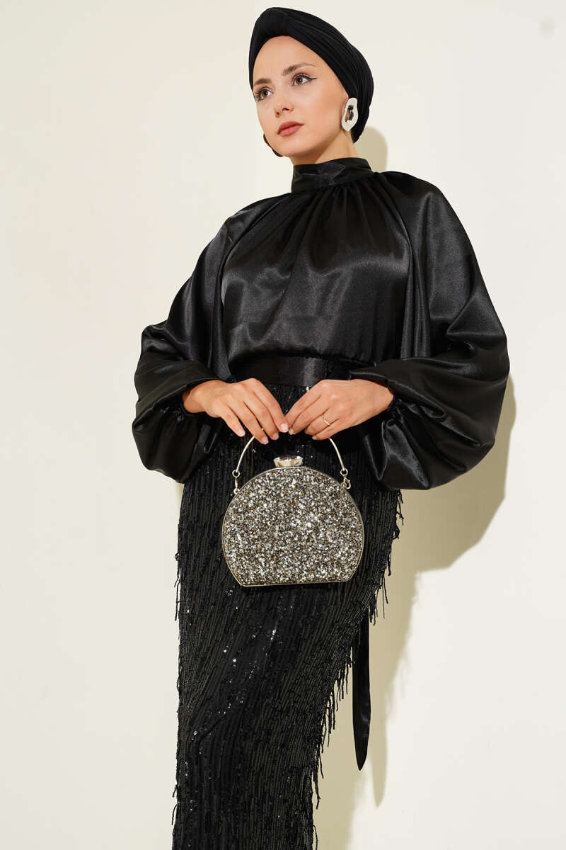 Yan Büzgülü Gold Tokalı Saten Abiye Siyah