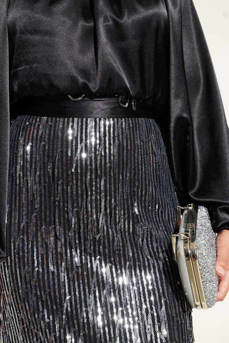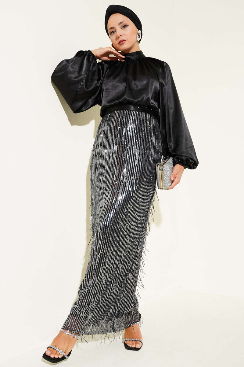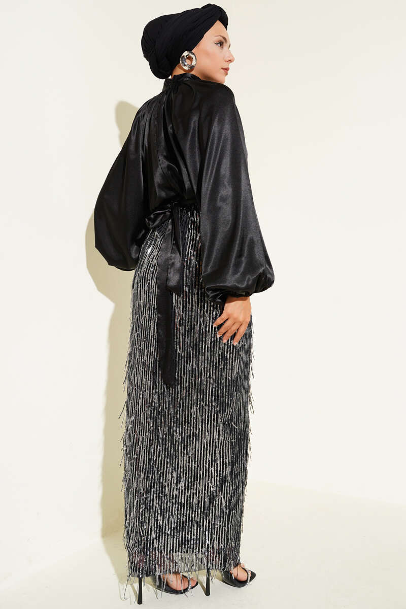 Kuşaklı Pul Payetli Abiye Elbise Siyah Gümüş
