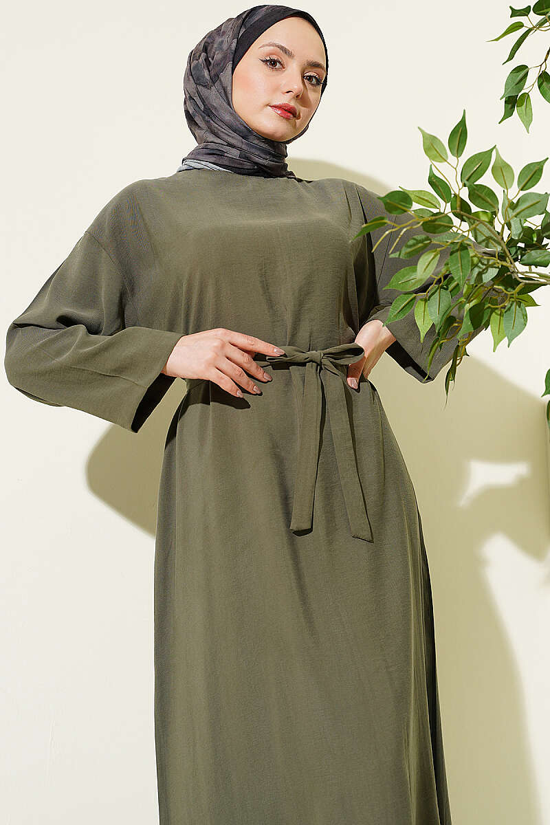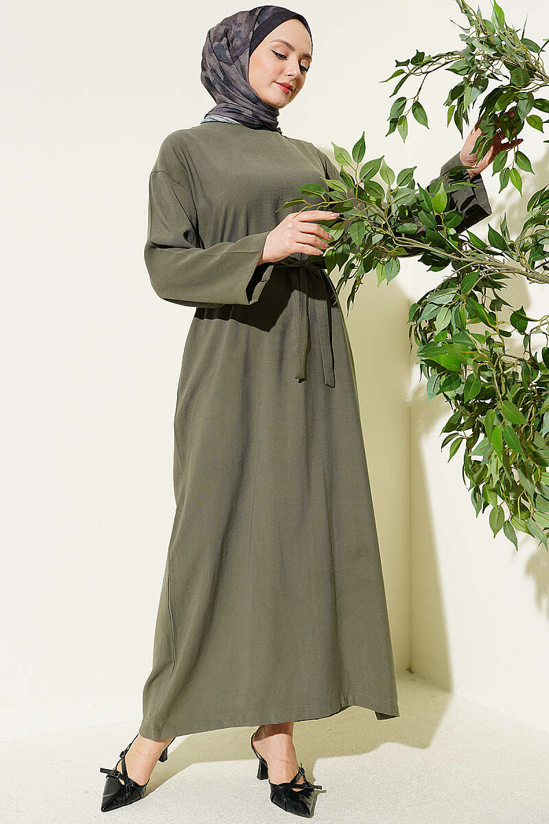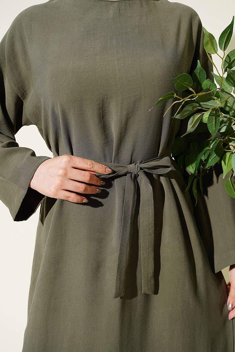 Bu elbise, minimalist tasarımı ve salaş kesimiyle modern bir zarafet sunarak gün boyu konforlu bir kullanım vadeder. Bel kısmında yer alan kuşak detayı, dökümlü formu isteğe göre şekillendirmenize olanak tanırken silüetinize daha belirgin ve şık bir hat kazandırır. Bisiklet yaka ve geniş kol yapısıyla birleşen düz dokusu, zamansız bir stil oluşturarak hem günlük aktivitelerinizde hem de özel buluşmalarınızda rahatlıkla tercih edilebilir. Akışkan kumaş yapısı ve sade duruşuyla, farklı aksesuarlarla kolayca kişiselleştirilebilecek gardırobunuzun en temel parçalarından biri olmaya adaydır.