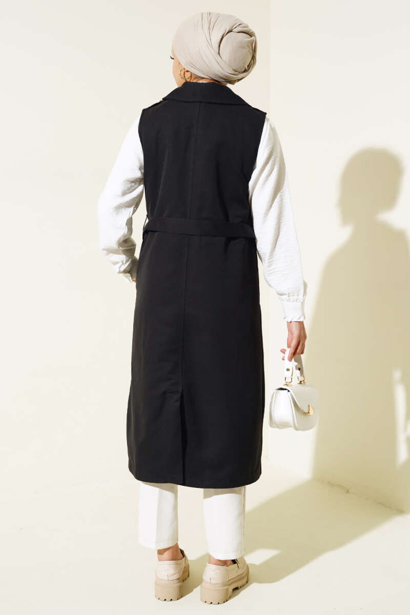 Kuşaklı Sıfır Kol Trençkot Siyah