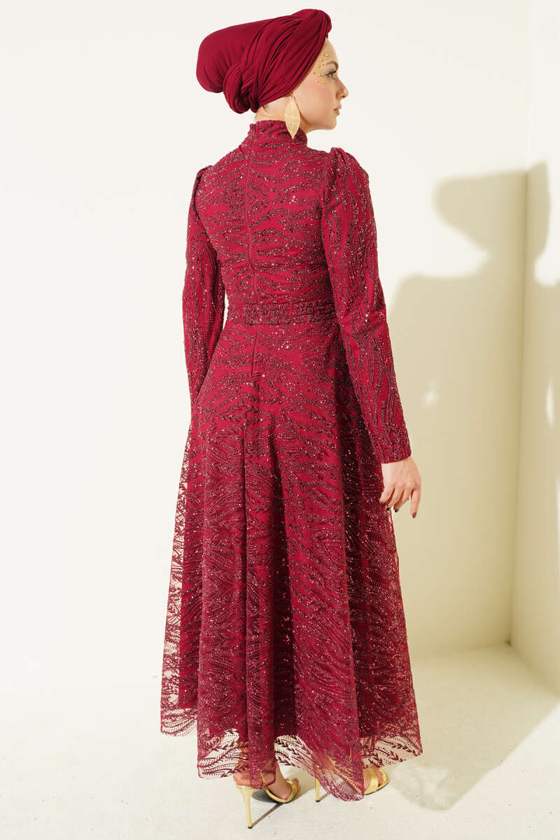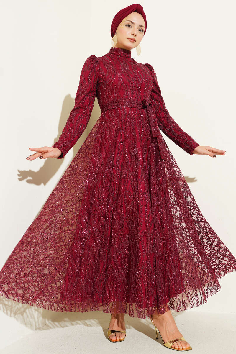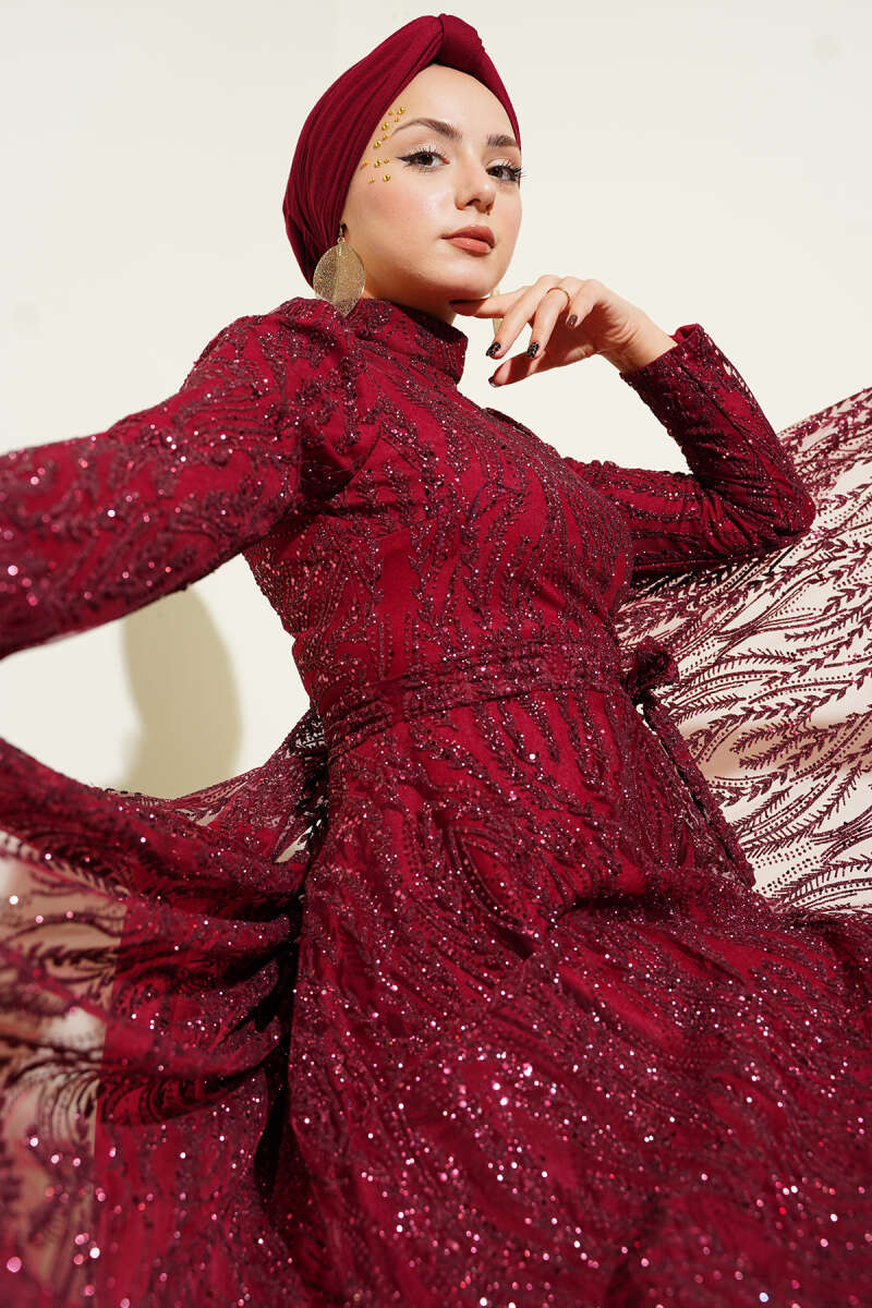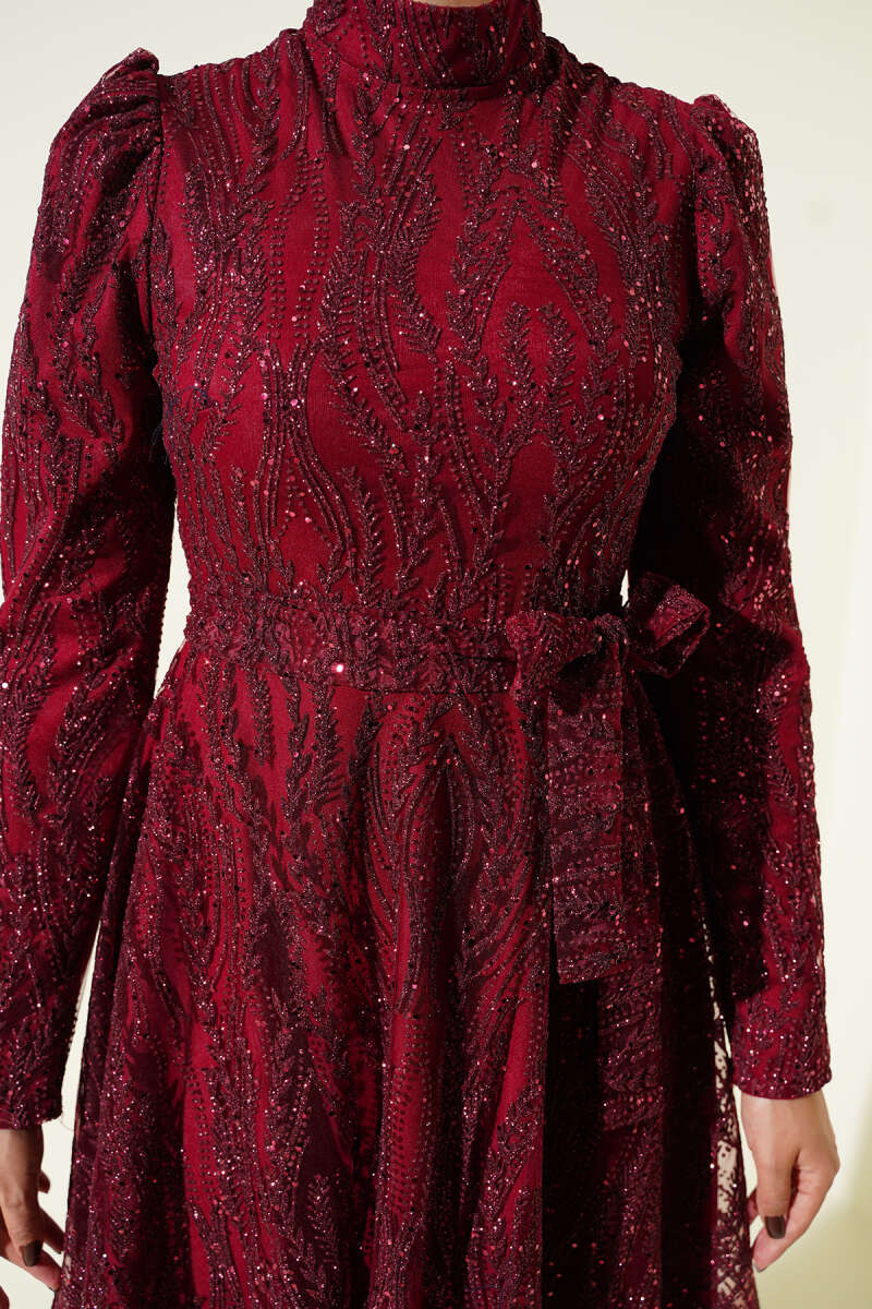 Taş Şeritli Tül Pelerinli Abiye Elbise Bordo
