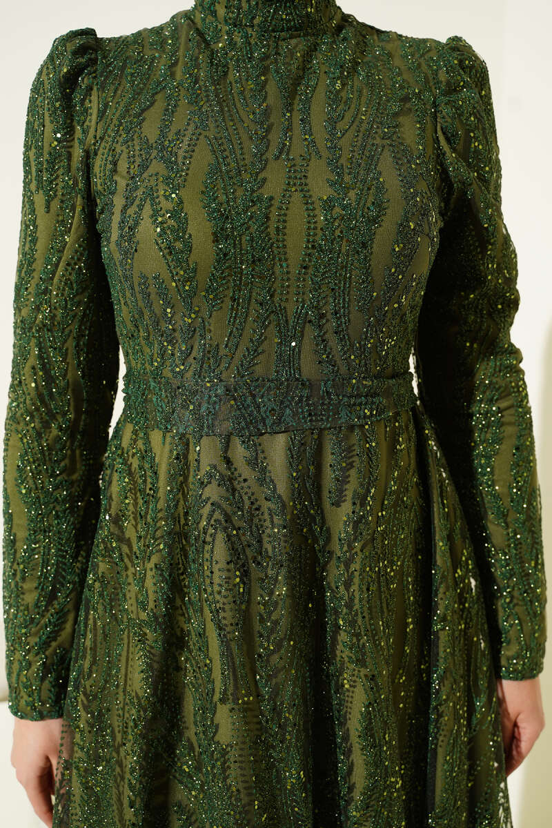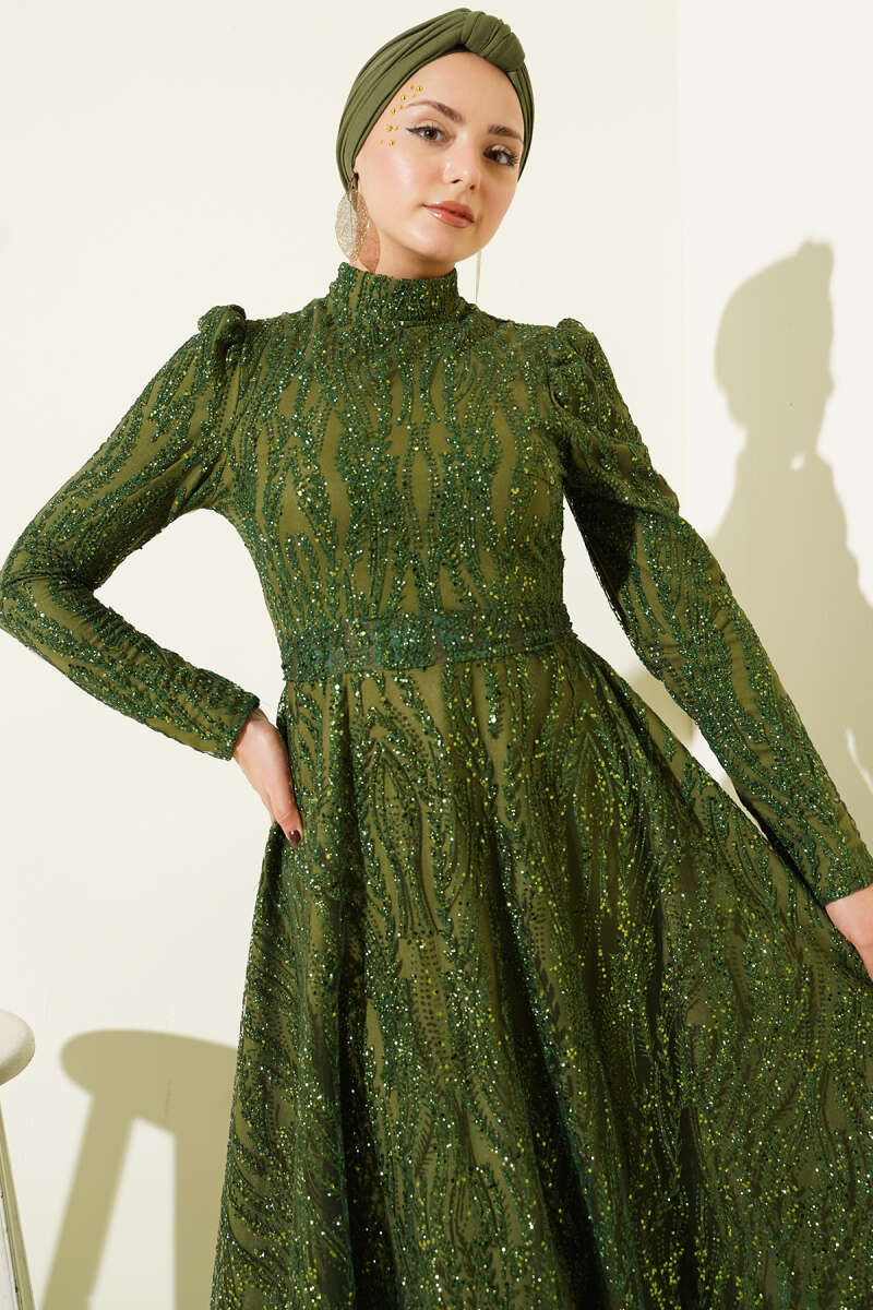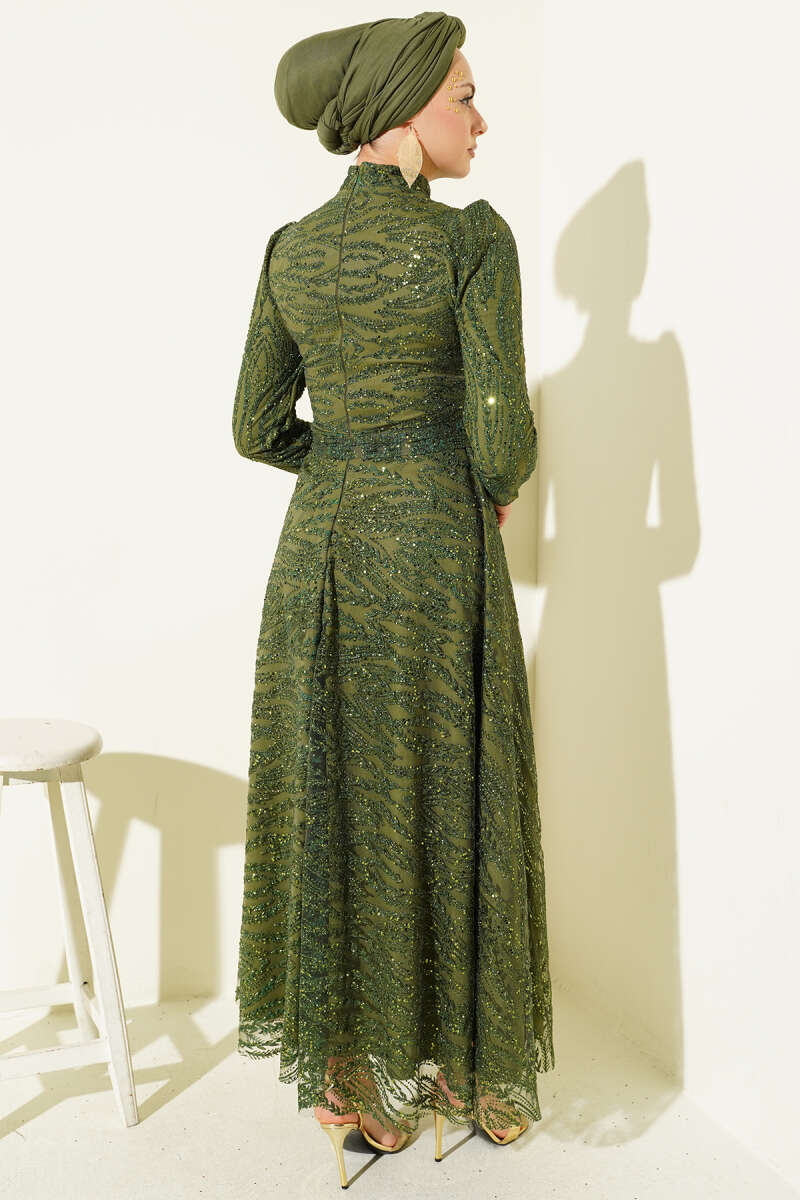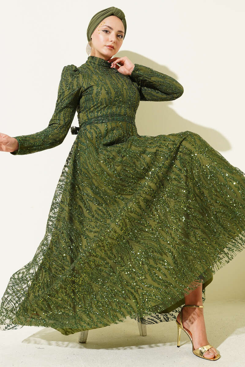 Bel Taşlı Pul Payet Detaylı Abiye Elbise Haki