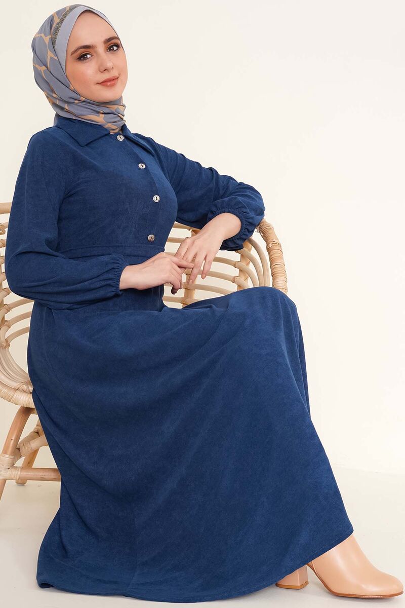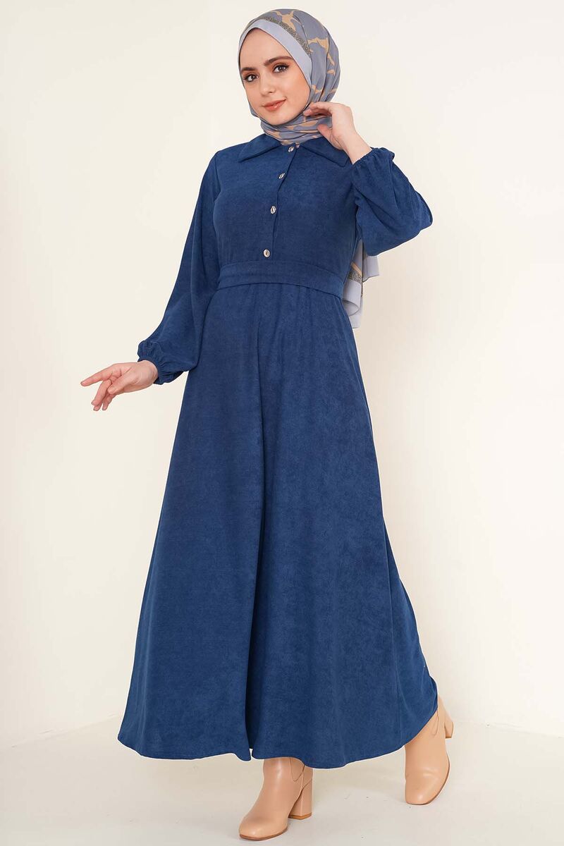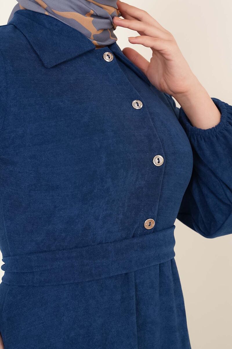 Şık ve oldukça havalı elbisemiz yarım düğmelidir. Dört düğmeli ve klasik yaka olan elbisemiz kuşaklıdır. Kuşağı elbisemizi şık bir tasarıma kavuşturmuştur. Bilekleri lastikli olan elbisemiz gündelik hayatınızda olduğu kadar özel gün ve gecelerinzide de size eşlik edecektir.