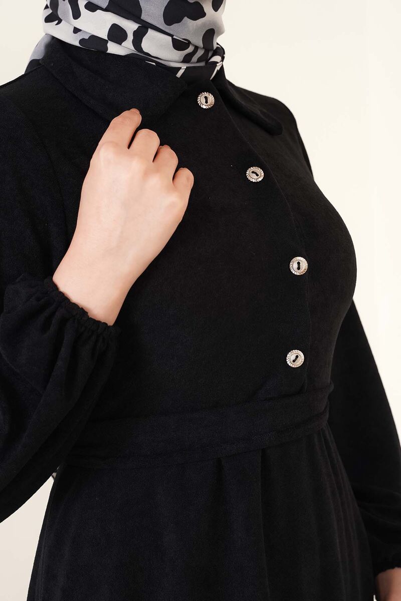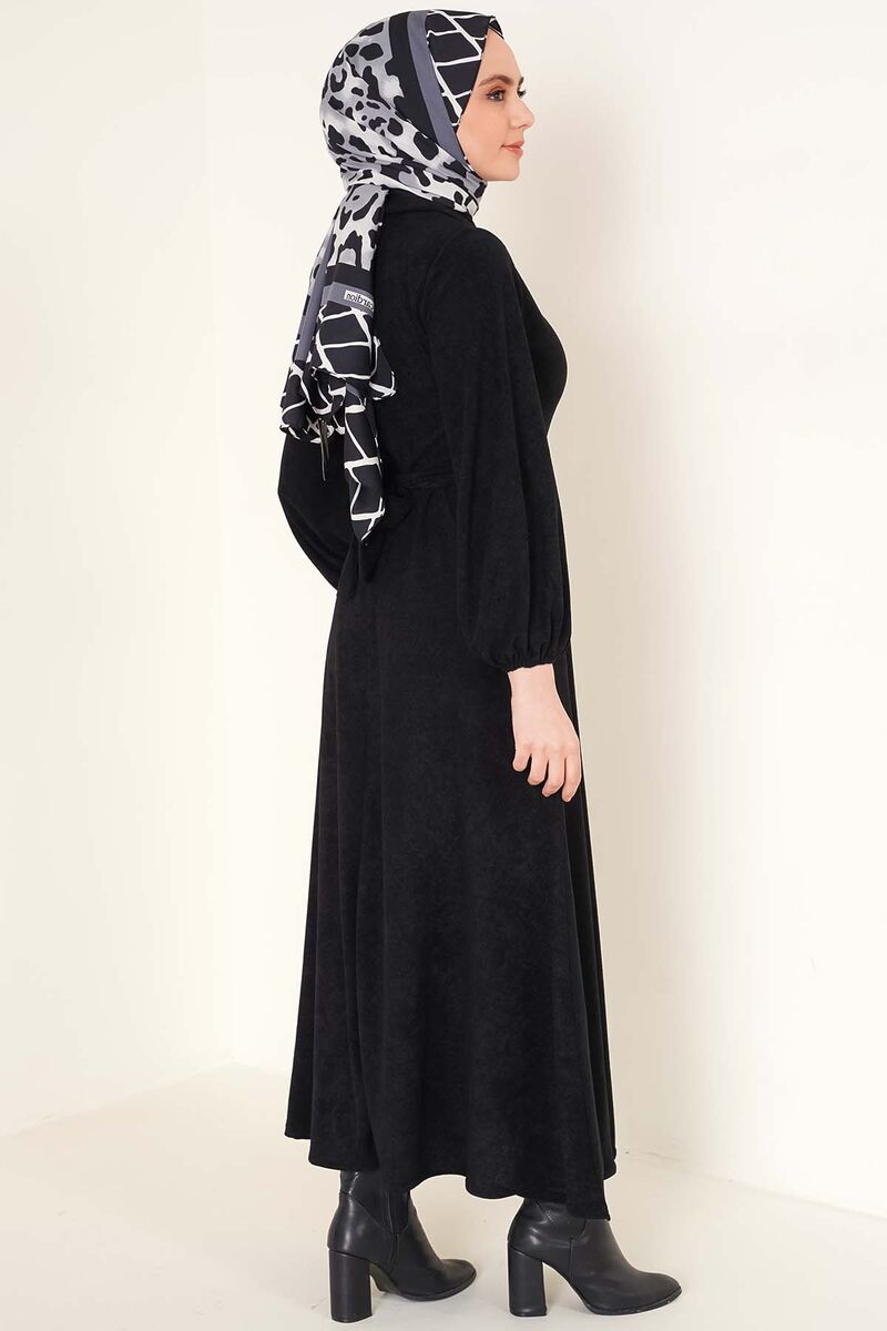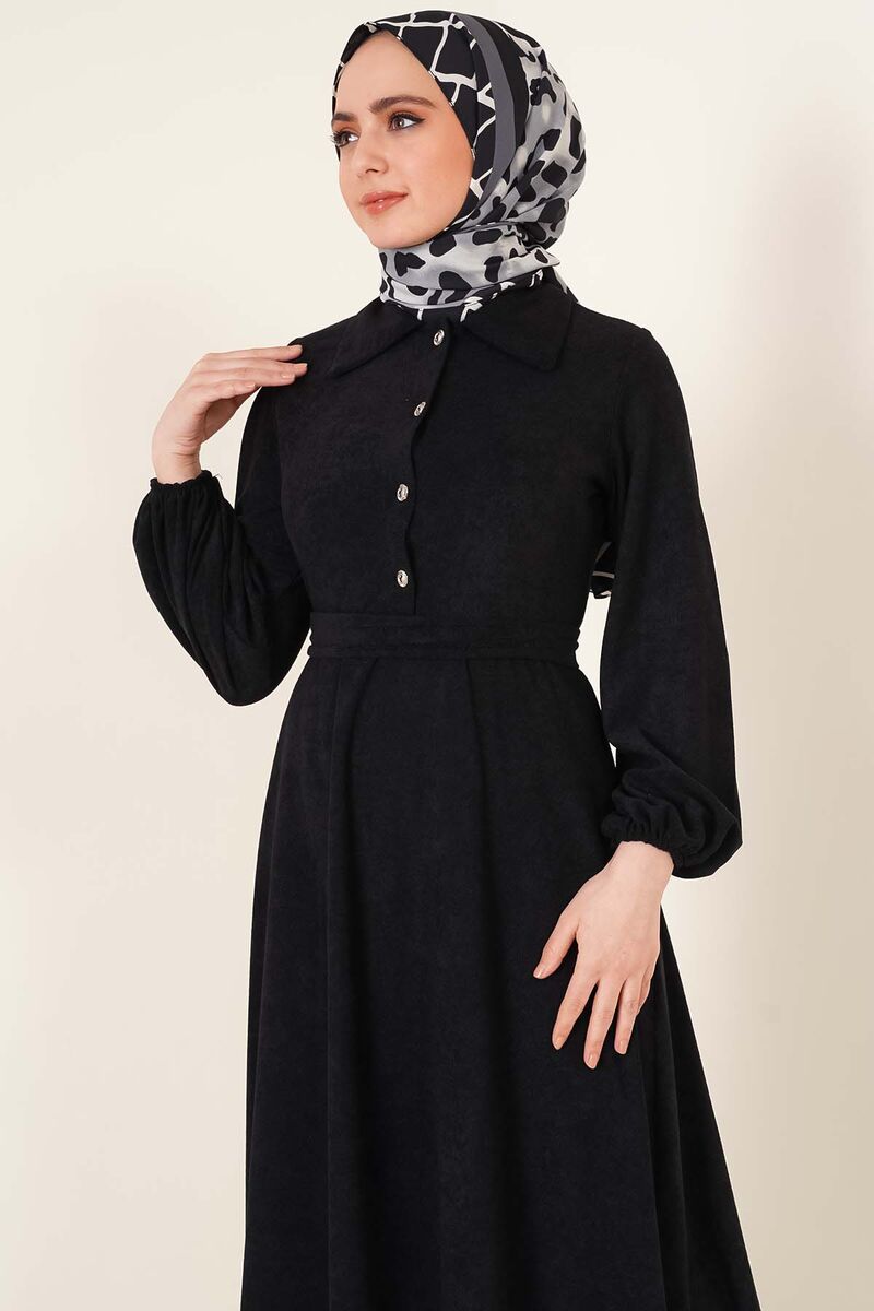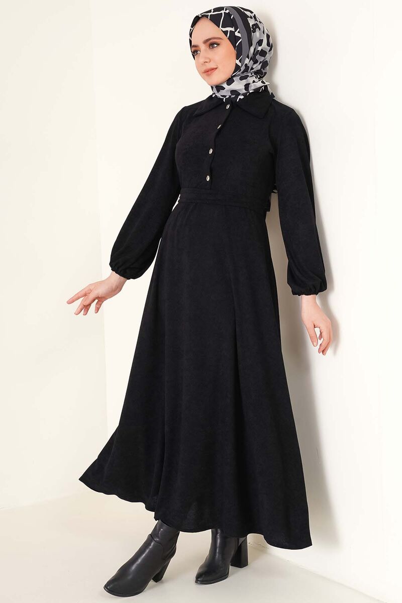 Kuşaklı Yarım Düğemli Elbise Siyah