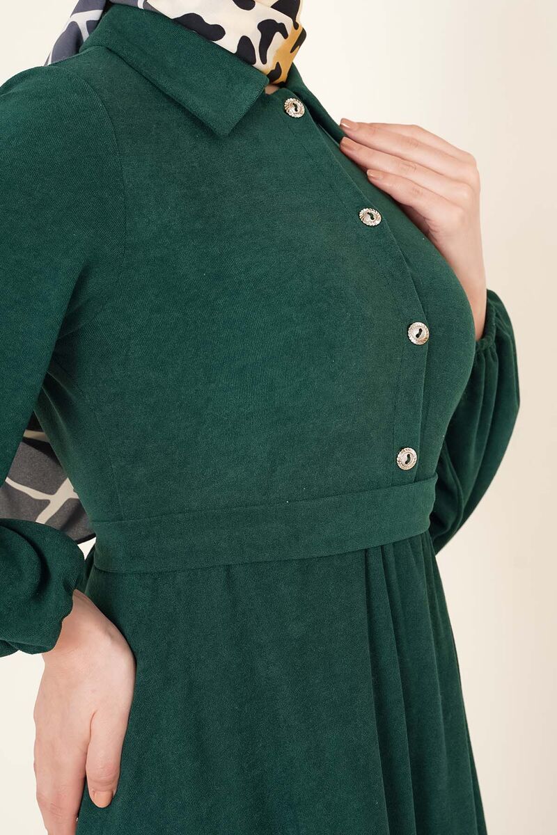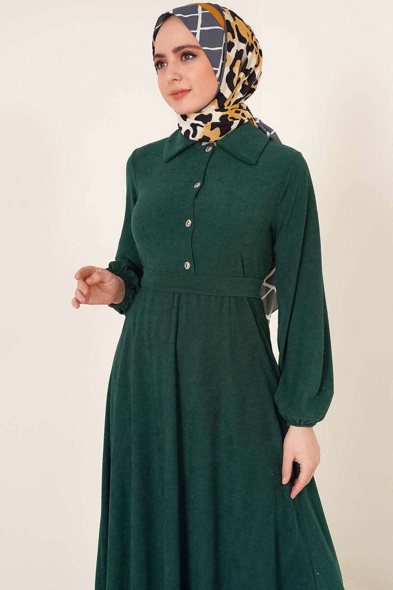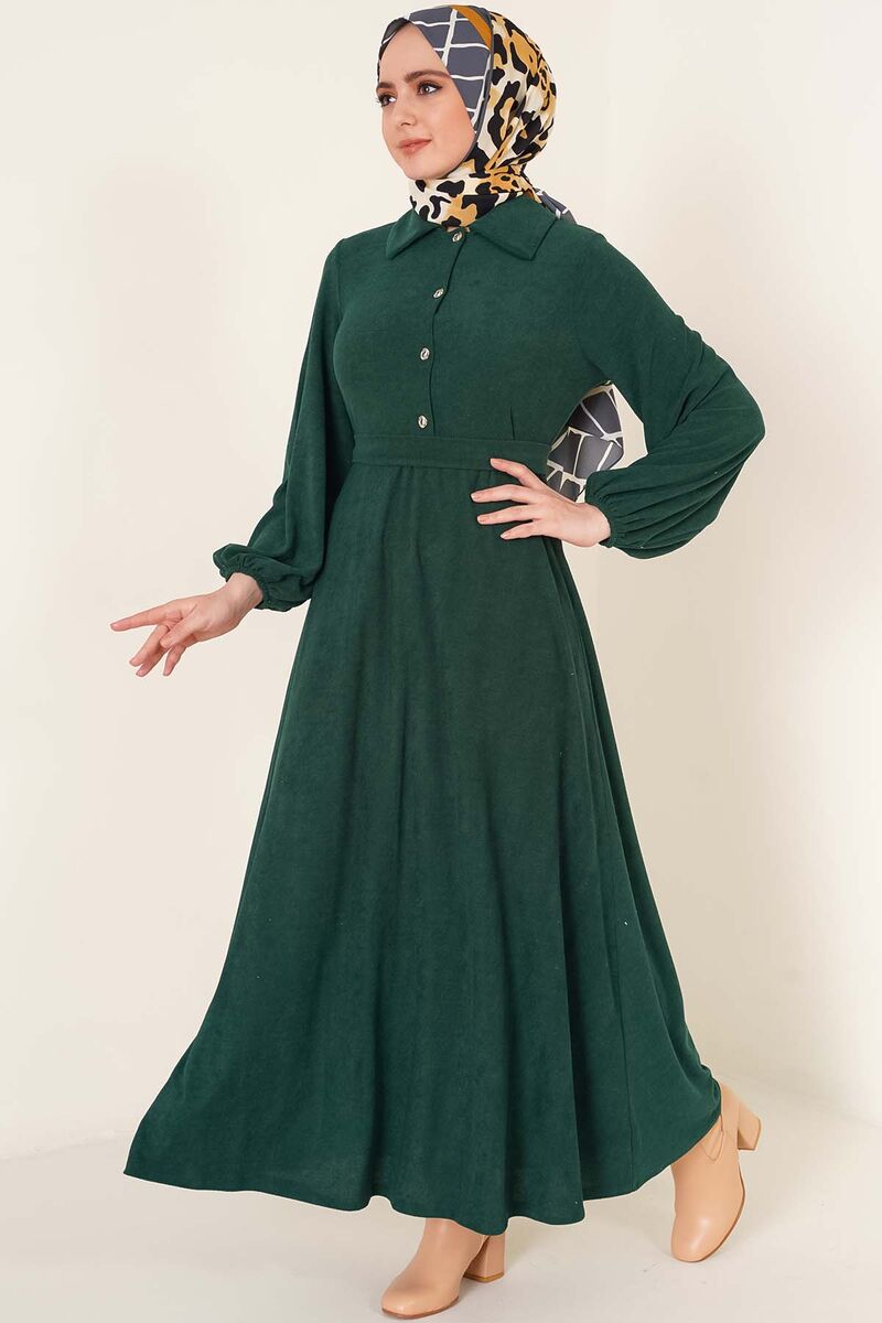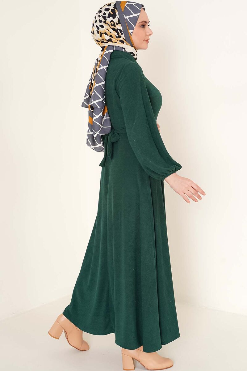Kuşaklı Yarım Düğemli Elbise Zümrüt Yeşili