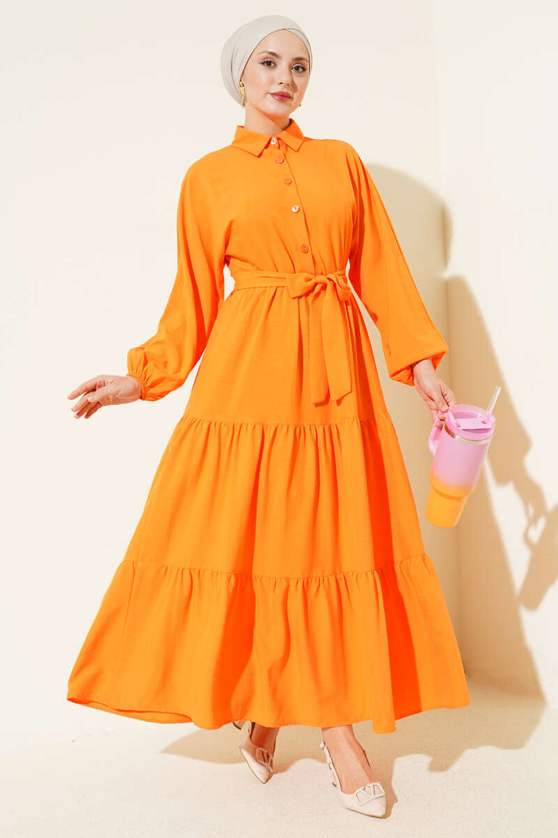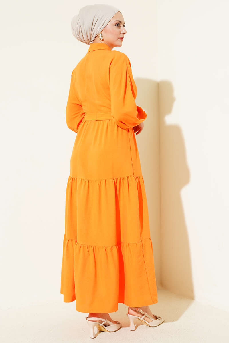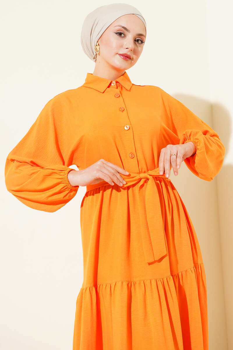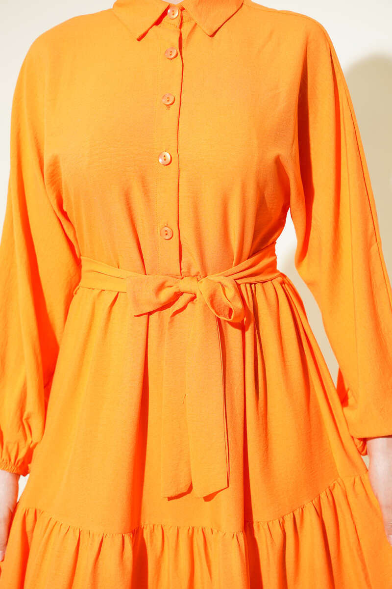 Kuşaklı Yarım Düğmeli Kat Elbise Oranj