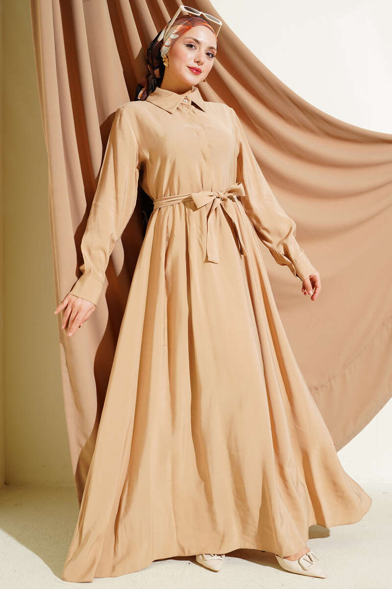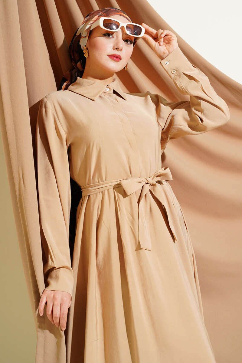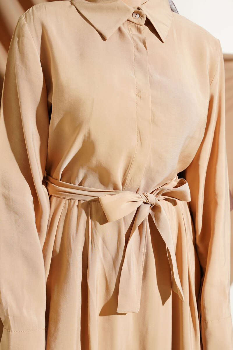Kuşaklı Yarım Yaka Düğmeli Tensel Elbise Bej