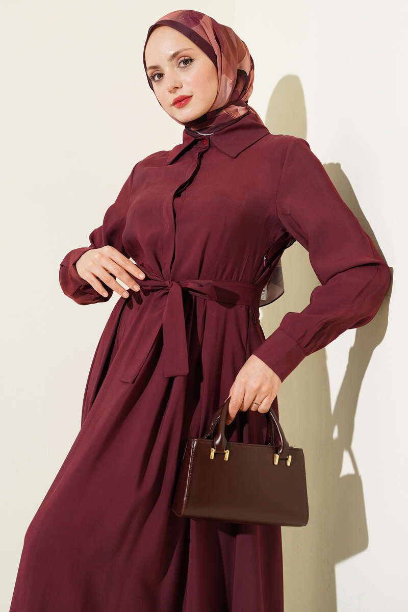 Kuşaklı Yarım Yaka Düğmeli Tensel Elbise Vizon