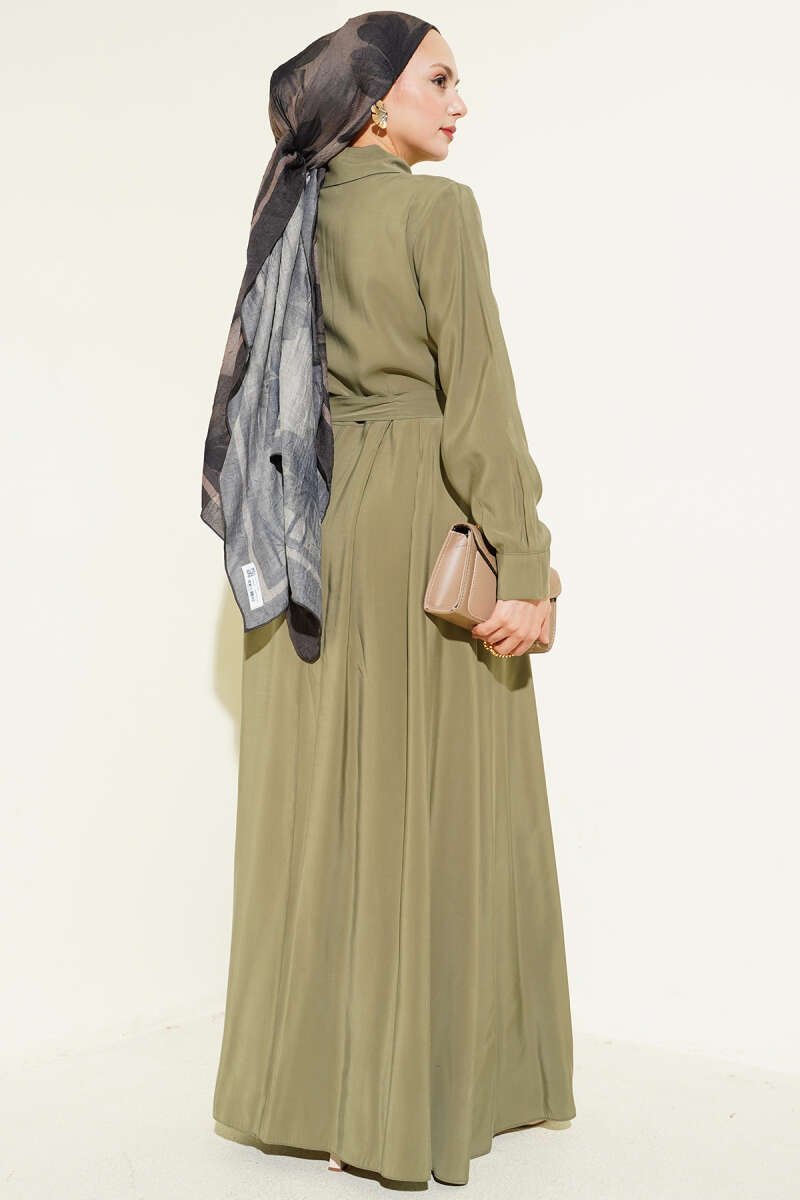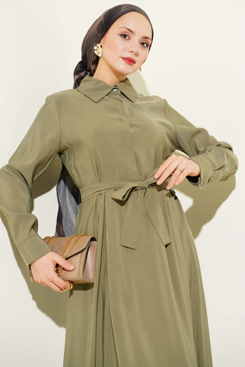 Bel Lastikli Fermuarlı Tensel Elbise Haki