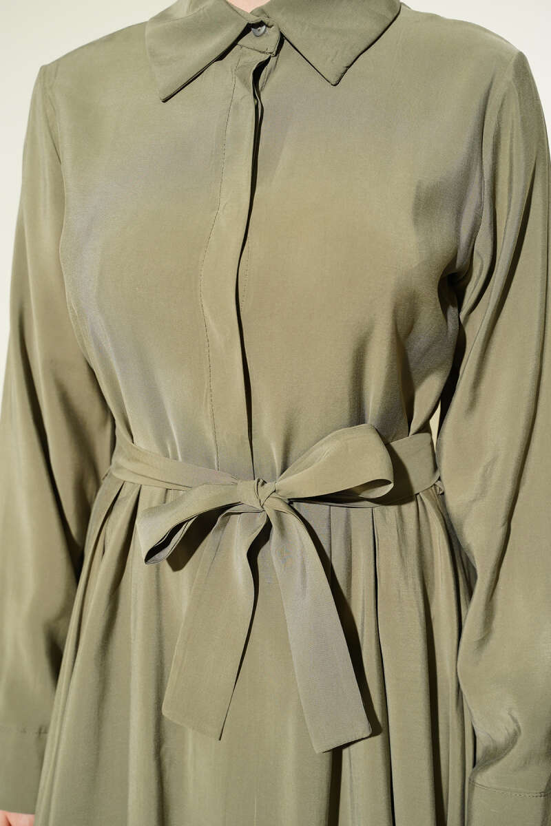 Kuşaklı Yarım Yaka Düğmeli Tensel Elbise Vizon