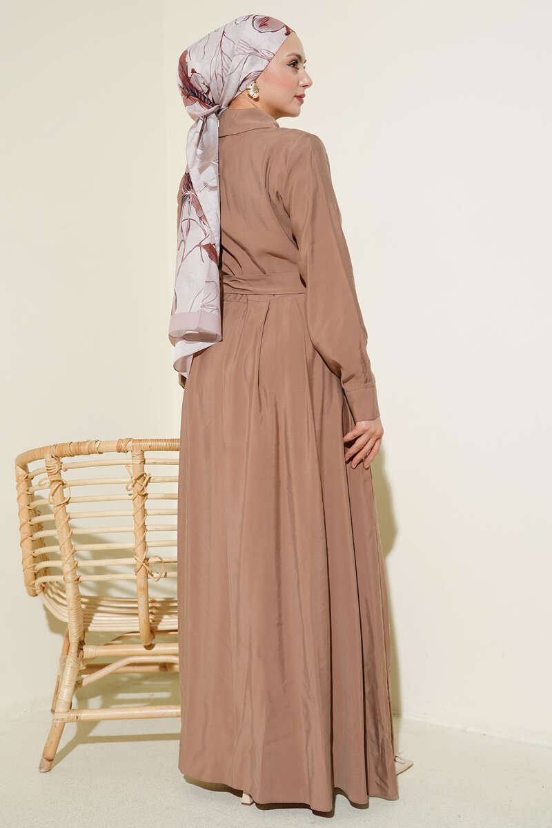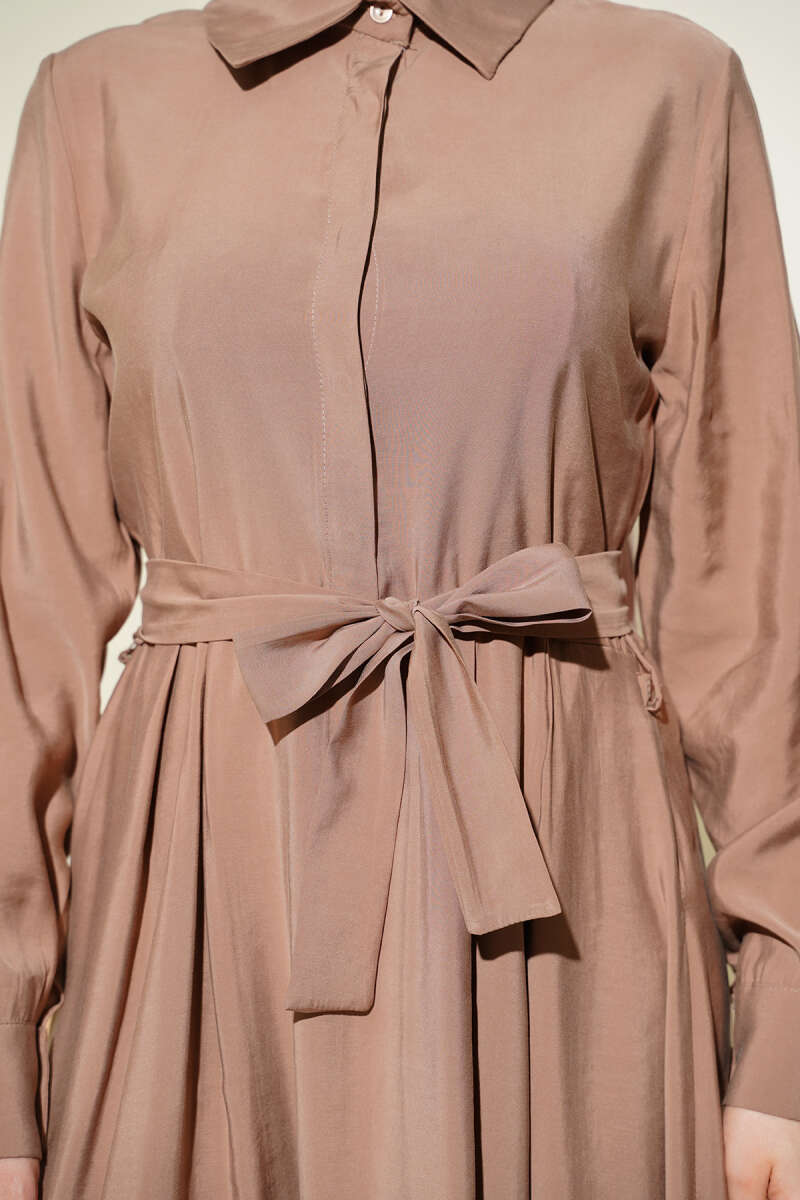 Kuşaklı Yarım Yaka Düğmeli Tensel Elbise Vizon