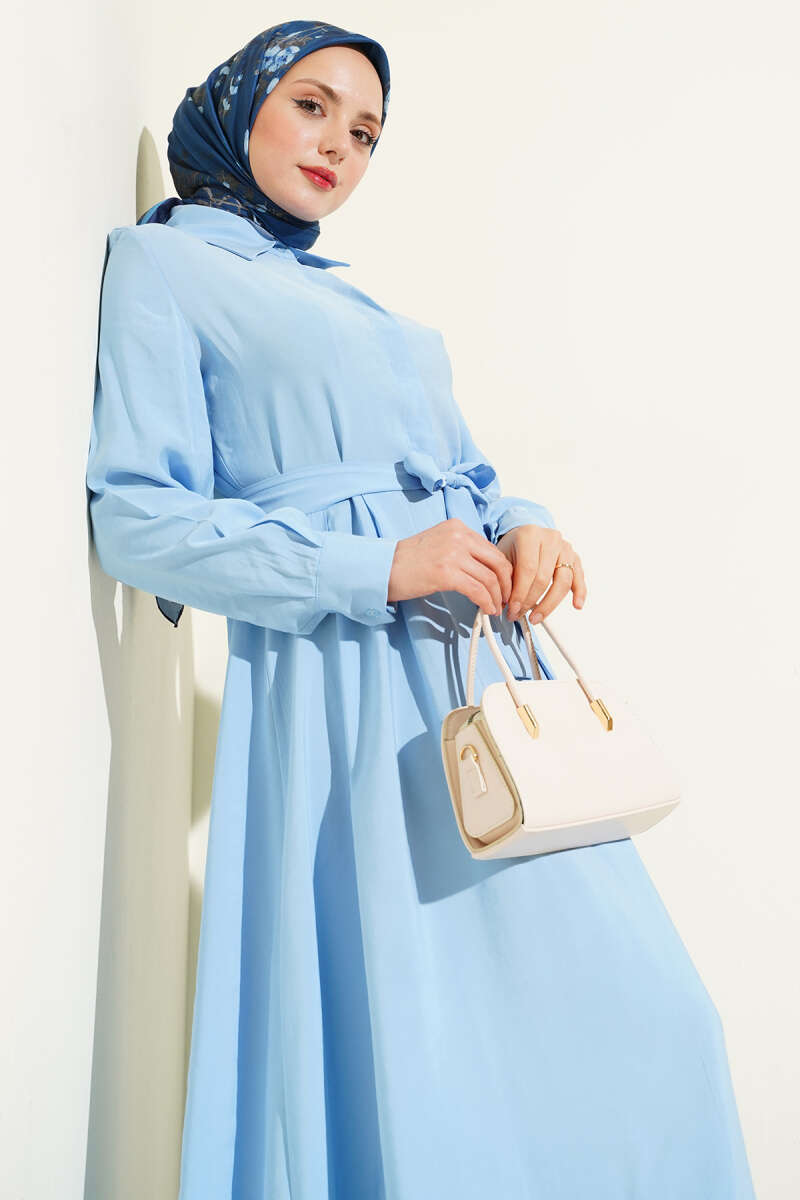 Kuşaklı Yarım Yaka Düğmeli Tensel Elbise Vizon