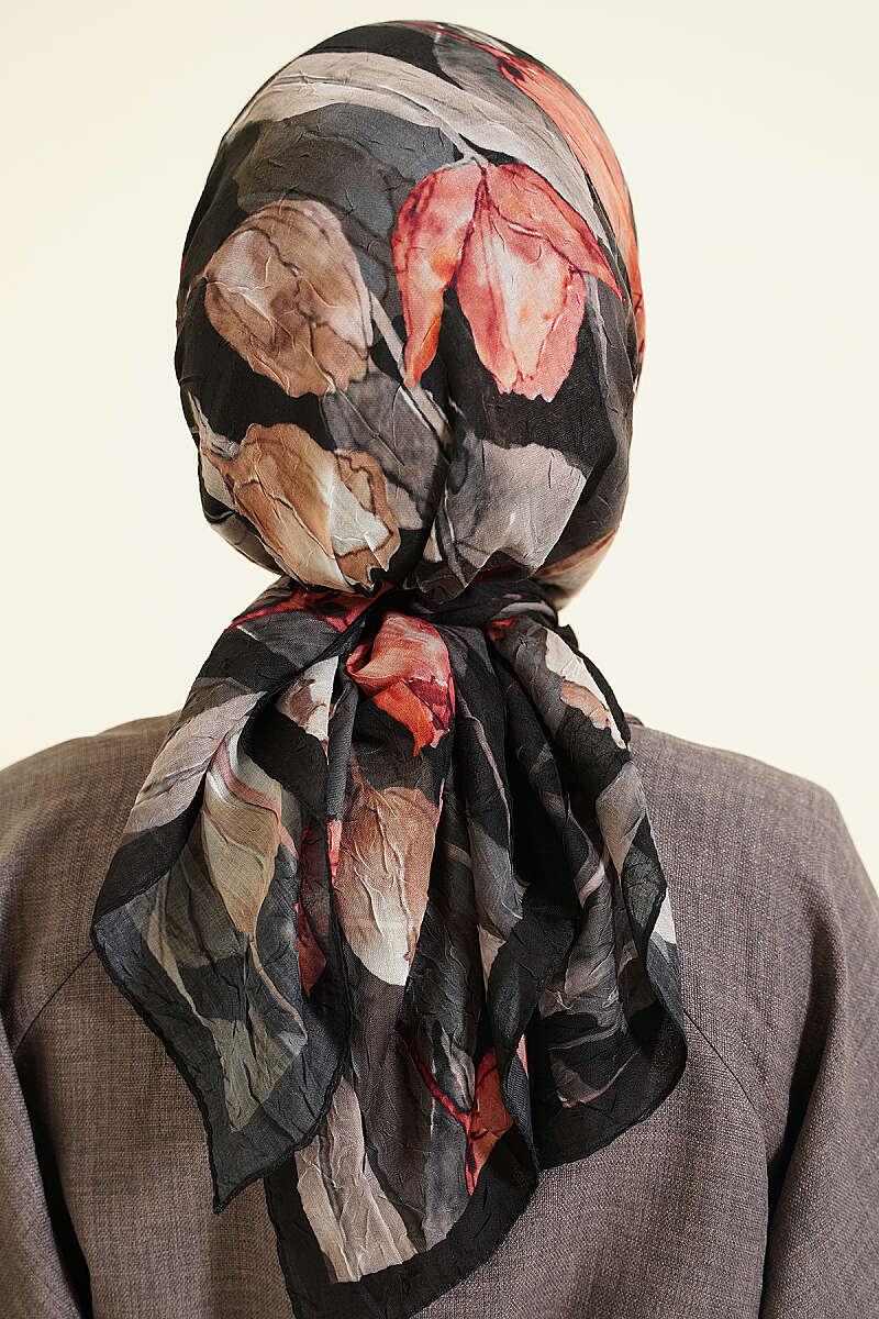 Lale Desen Bambu Kraş Eşarp Siyah