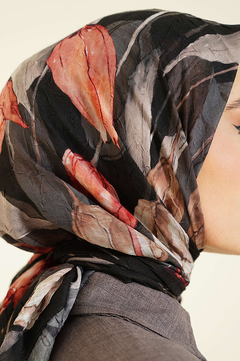 Lale Desen Bambu Kraş Eşarp Siyah Kahve