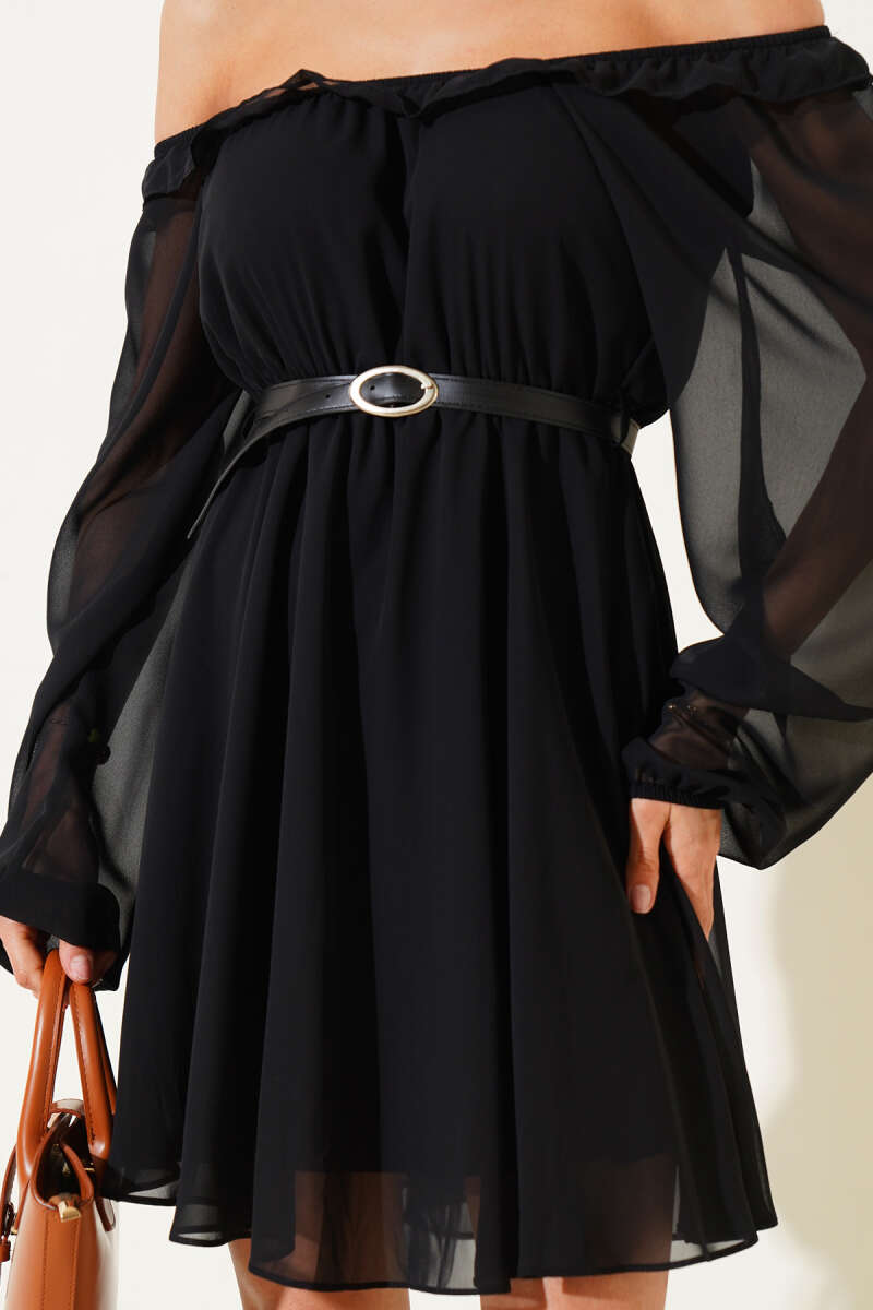 Lastikli Yaka Kemerli Şifon Mini Elbise Siyah